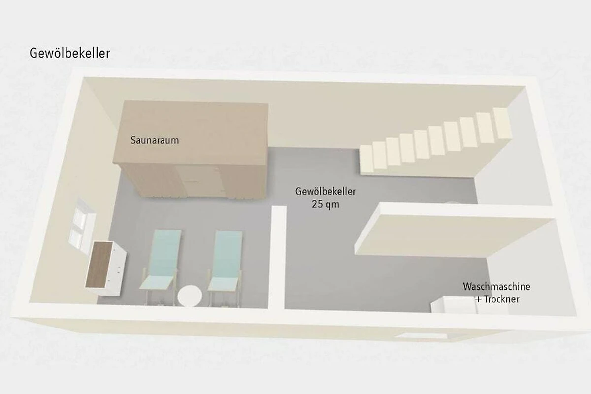 Zwischengeschoss: (Ruheraum(, Sauna), Abstellraum(, Waschmaschine, Bügeleisen, Trockenschrank))