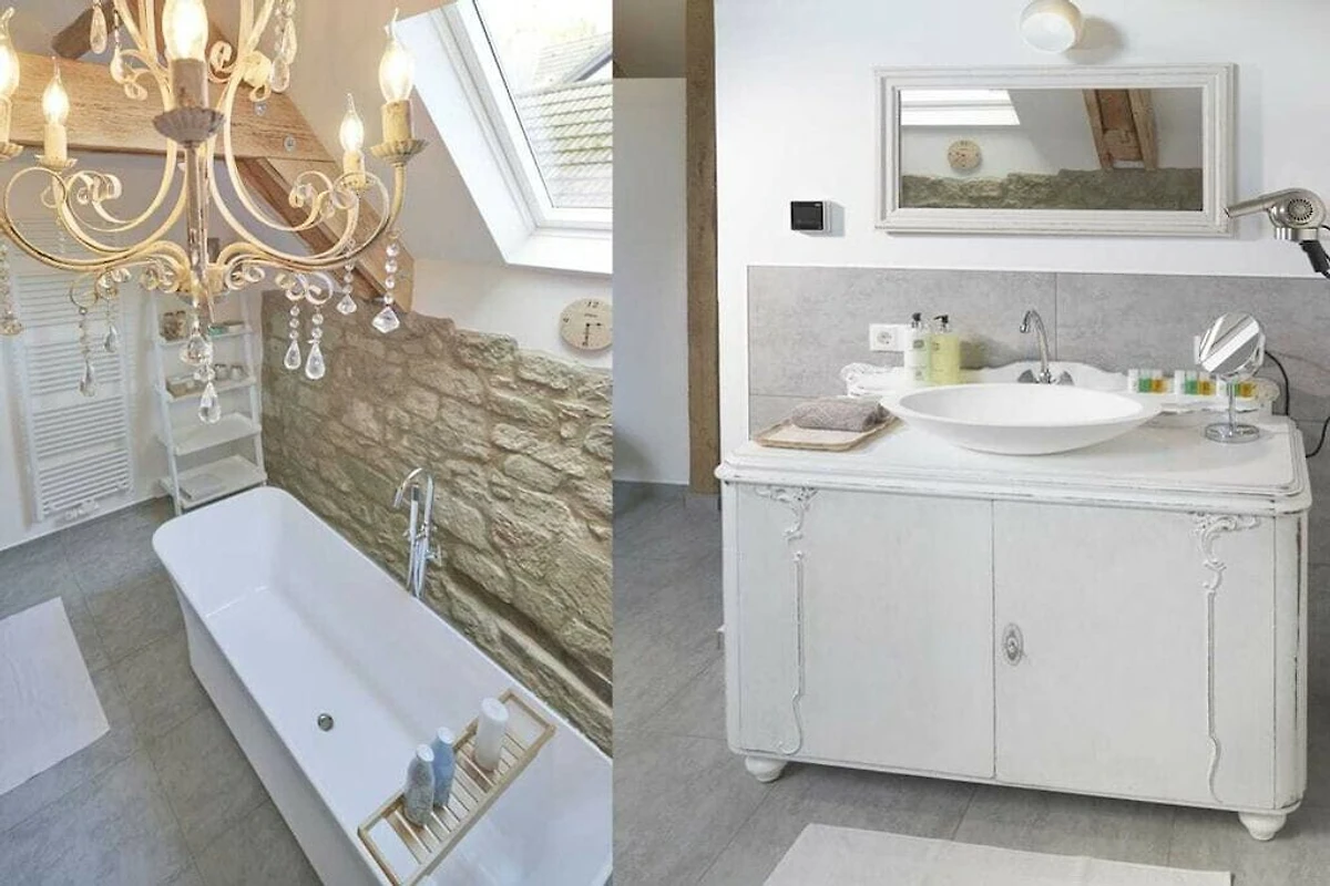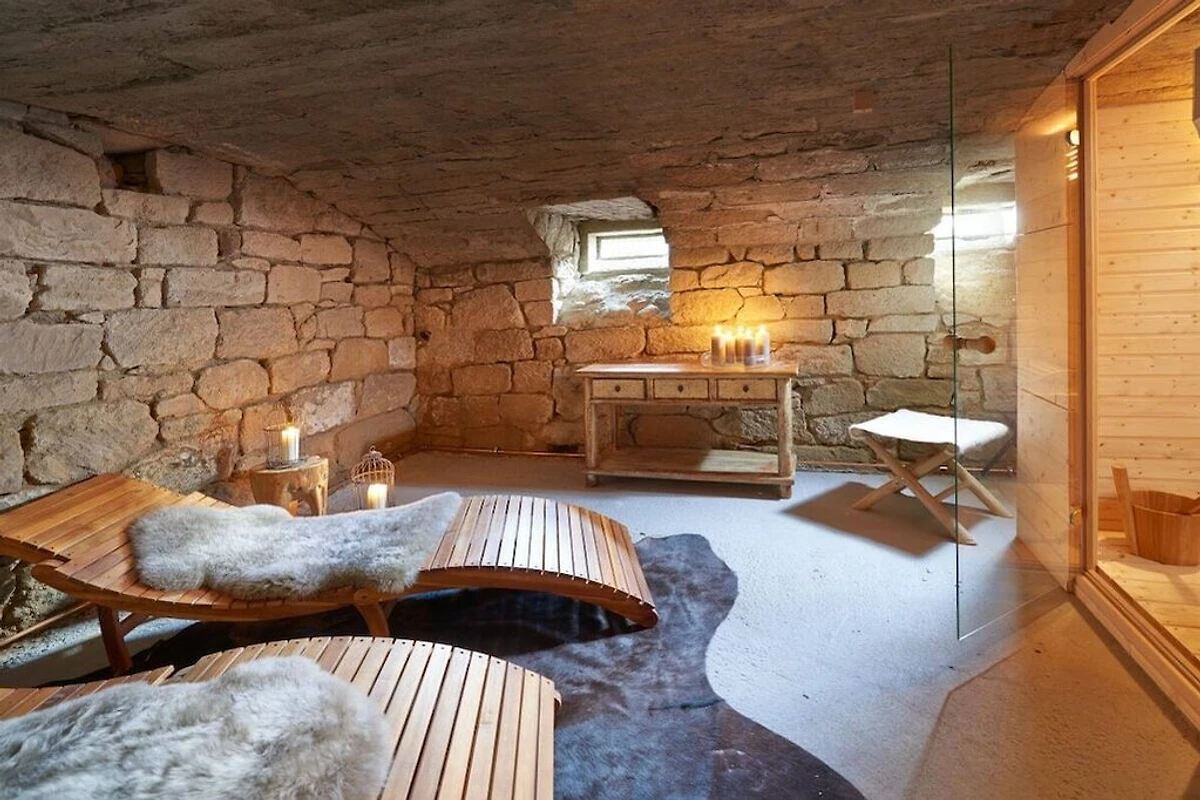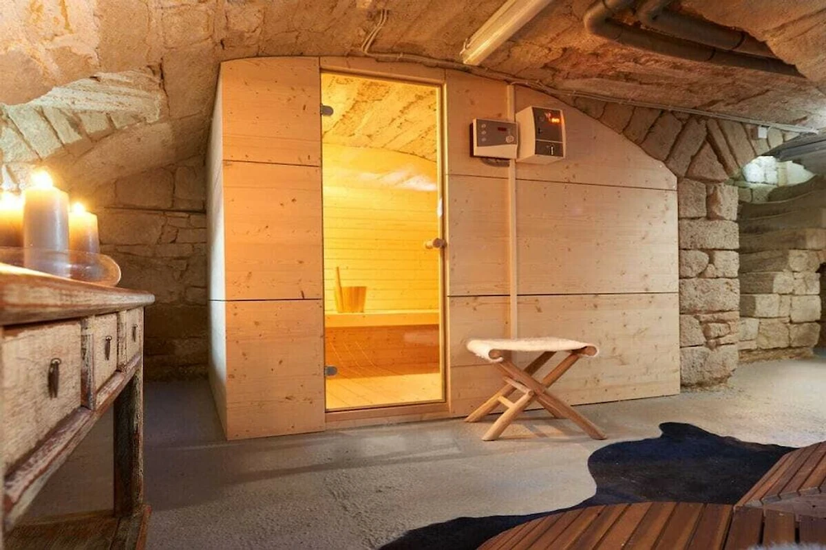 Das gemütliche Wohnzimmer verfügt über einen Kaminofen, weiterhin gibt es 3 gemütliche Schlafzimmer, eine komplett eingerichtete Wohnküche, zwei Bäder mit Badewanne, eins davon ist eine Whirlpool-Badewanne. Es befindet sich eine finnische Sauna mit Ruheraum im Naturstein-Gewölbekeller.