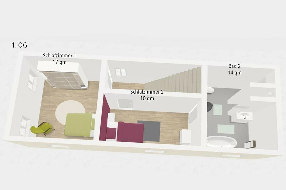 In der 1. Etage: (Schlafzimmer(, , Doppelbett, TV), Badezimmer(, Toilette, Badewanne, Waschbecken))