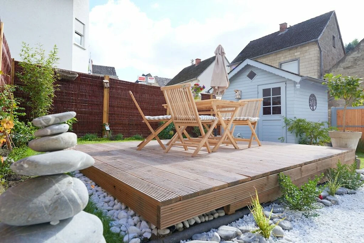 Hier finden Sie eine schöne Holzterrasse mit Sitzgruppe und einer separaten Lounge-Ecke.