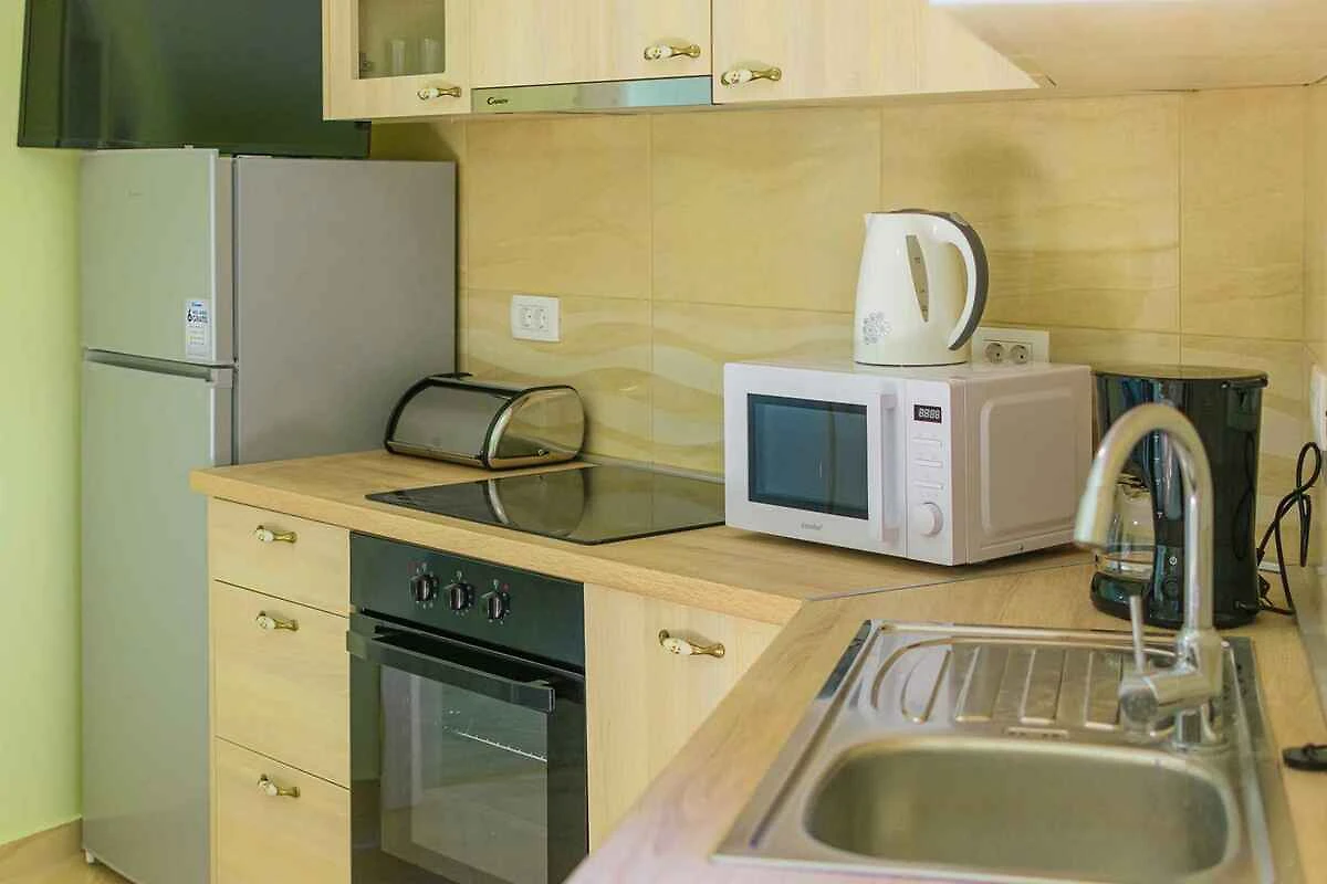 2 Schlafzimmer jeweils mit 1 Doppelbett. Küche mit TV, Gasherd, Backofen, Geschirrspüler, Kühlschrank (Eisfach), Mikrowelle, Kaffeemaschine, Toaster und elektrischem Wasserkocher. Bad mit Dusche und Föhn.
