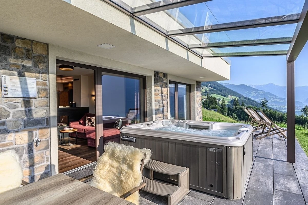 grosse überdachte Terrasse mit Whirlpool & Wellnessliegen