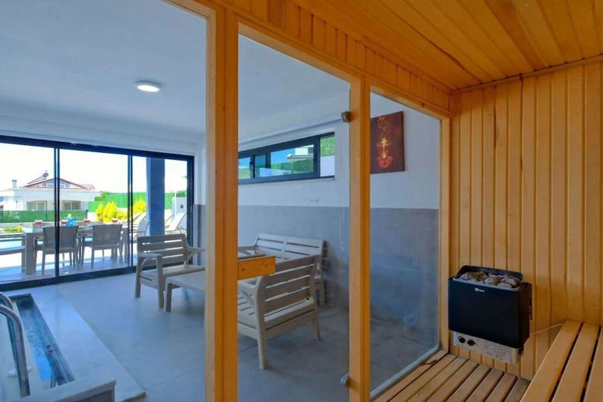 , , Schlafzimmer(, , Doppelbett, Klimaanlage), Schlafzimmer(, , Doppelbett, Klimaanlage), Schlafzimmer(, , Einzelbett, Einzelbett, Klimaanlage), Schlafzimmer(, , Einzelbett, Einzelbett, Klimaanlage), Internet, Internet, Waschmaschine, Terrasse(, Gartenmöbel, Liegen), Parkplatz, Bügeleisen, Trockenschrank, Alarmanlage