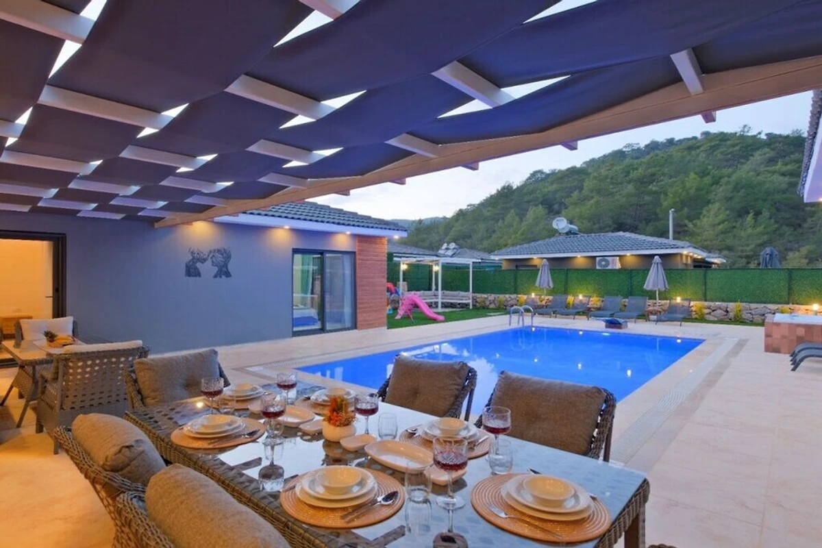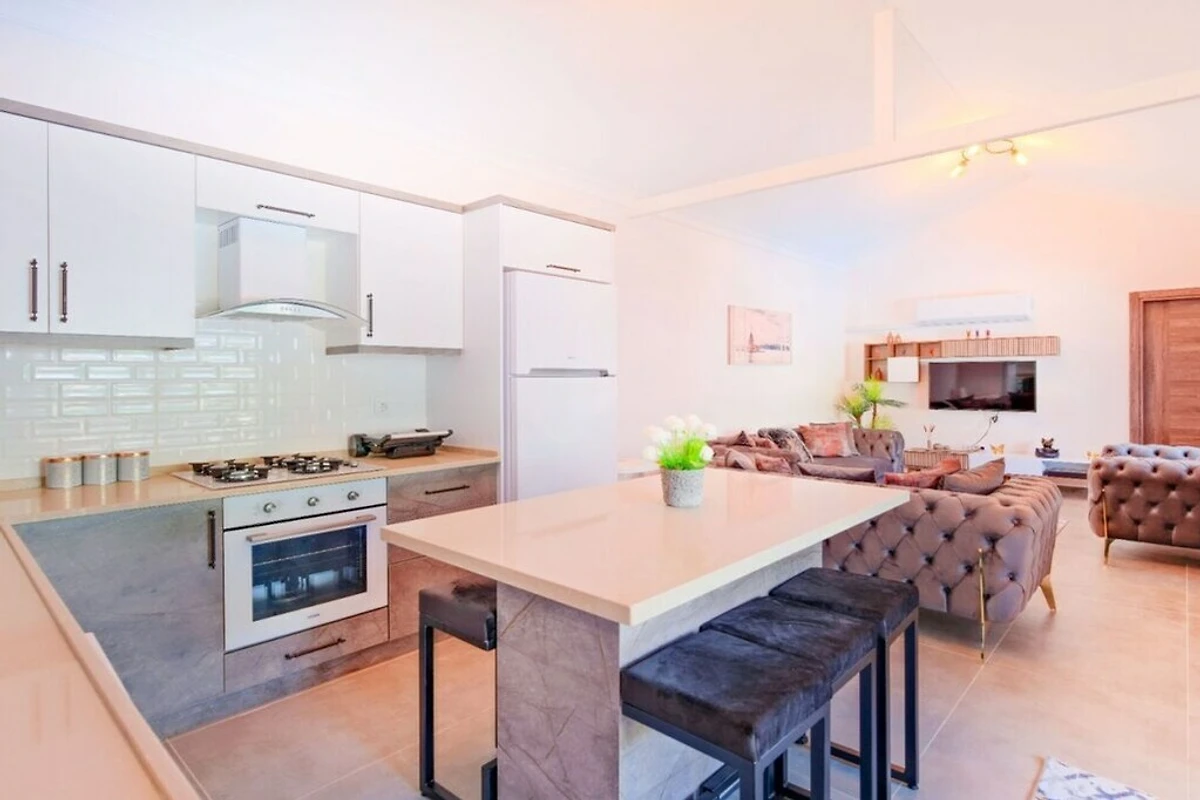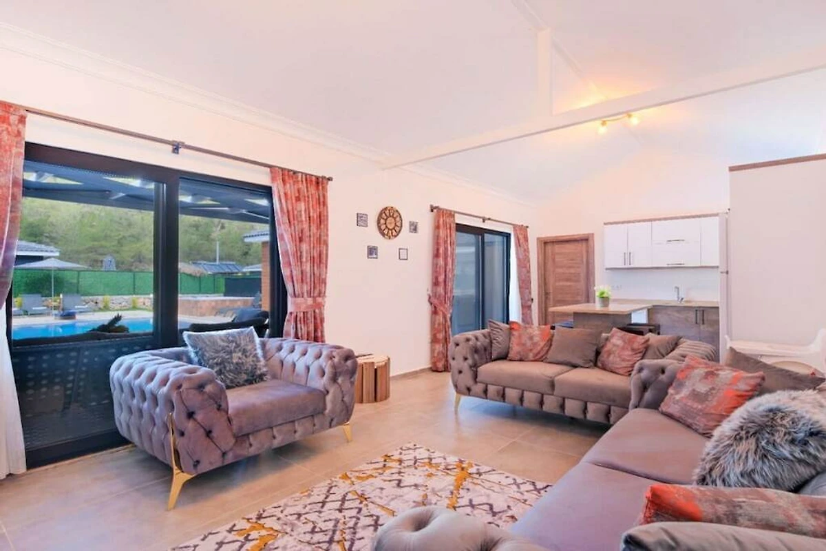 Villa Esp 2 in der Kayaköy-Region von Fethiye liegt in einer natürlichen Umgebung mit viel Grün. Die Villa verfügt über 4 Schlafzimmer, 4 Badezimmer und bietet Platz für 8 Personen. Der Innenraum ist geräumig und hat eine moderne Einrichtung, sowie eine voll ausgestattete Küche, einen Wohnbereich und einen Esstisch. Mit dem Jacuzzi im privaten Garten und der Terrasse können Sie eine angenehme Zeit verbringen und Ihren Urlaub unvergesslich machen. Die Umgebung ist ruhig und bietet eine friedliche Atmosphäre, um Ihnen während Ihres Urlaubs eine angenehme und komfortable Unterkunftserfahrung zu bieten.