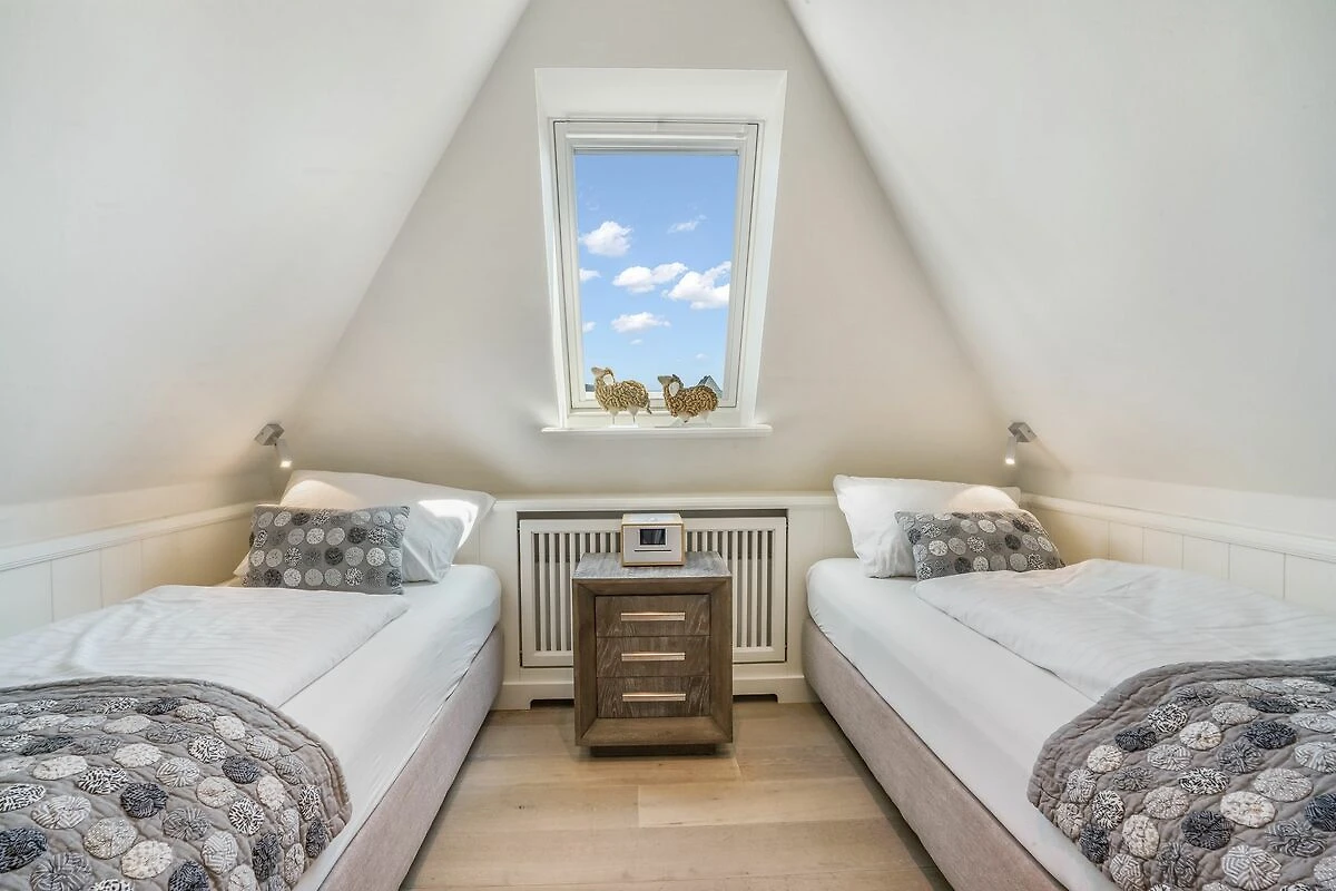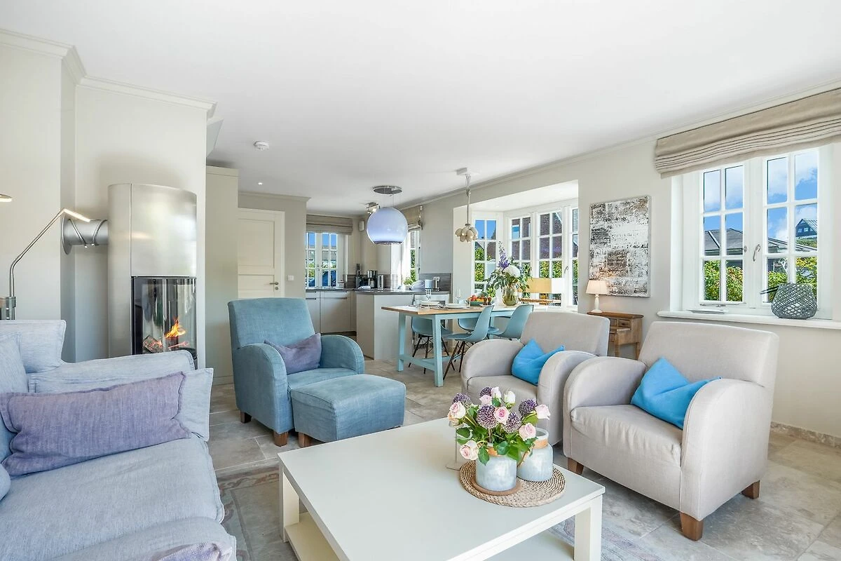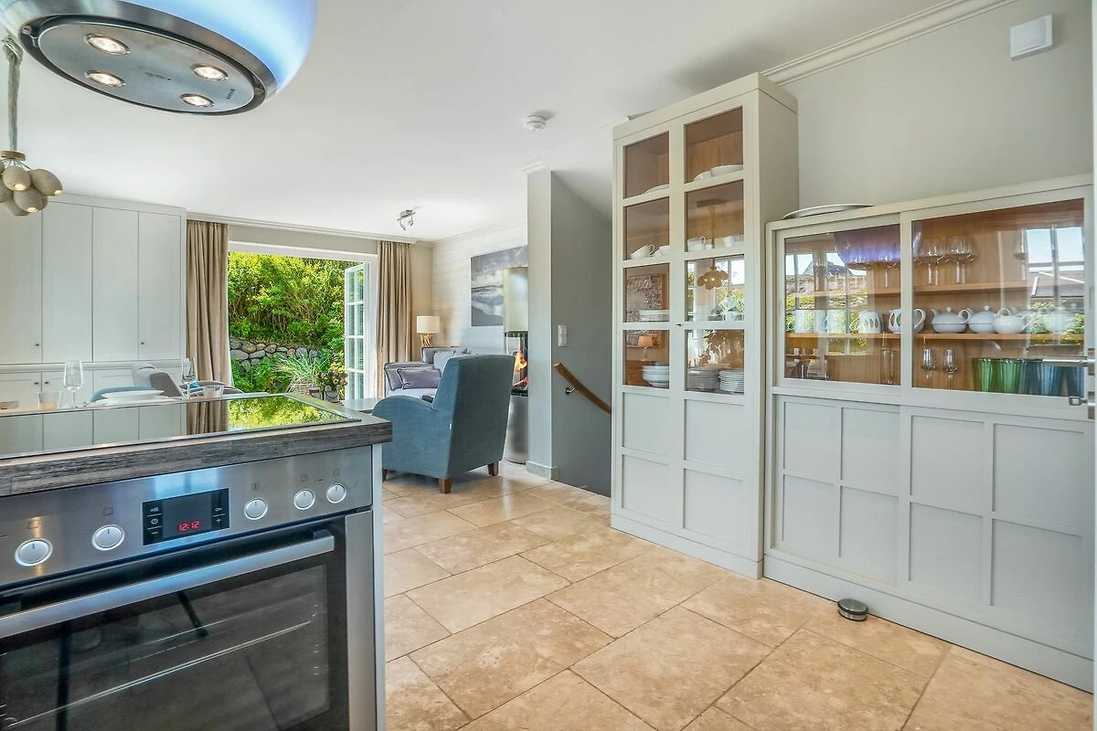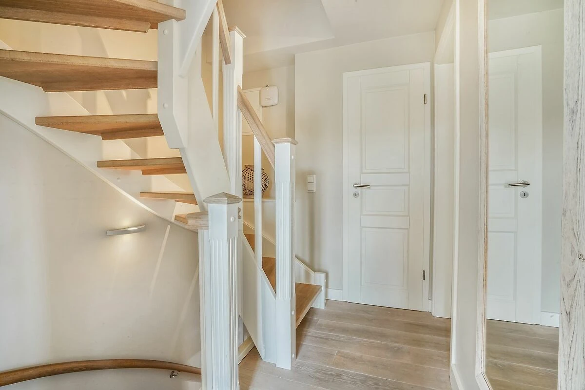 Im Erdgeschoss empfängt Sie ein offener Wohn- und Essbereich, der durch seine lichtdurchflutete Gestaltung besonders freundlich und einladend wirkt. Die voll ausgestattete hochwertige Küche mit Weinkühlschrank ist harmonisch in den Raum integriert - ideal für gemeinsames Kochen und gesellige Abende. Der gemütliche Wohnbereich mit Kamin lädt zum Entspannen ein. Von hier gelangen Sie direkt auf die Terrasse mit eigenem kleinem Gartenstück, Gartenmöbeln und Strandkorb (April – Oktober). Ihre Fahrräder können bequem an den vorhandenen Fahrradständern im Garten abgestellt werden.