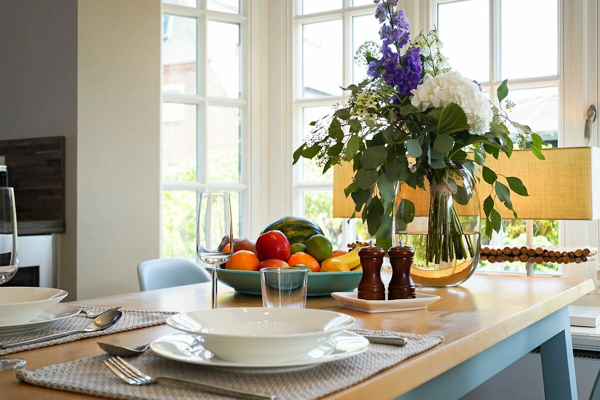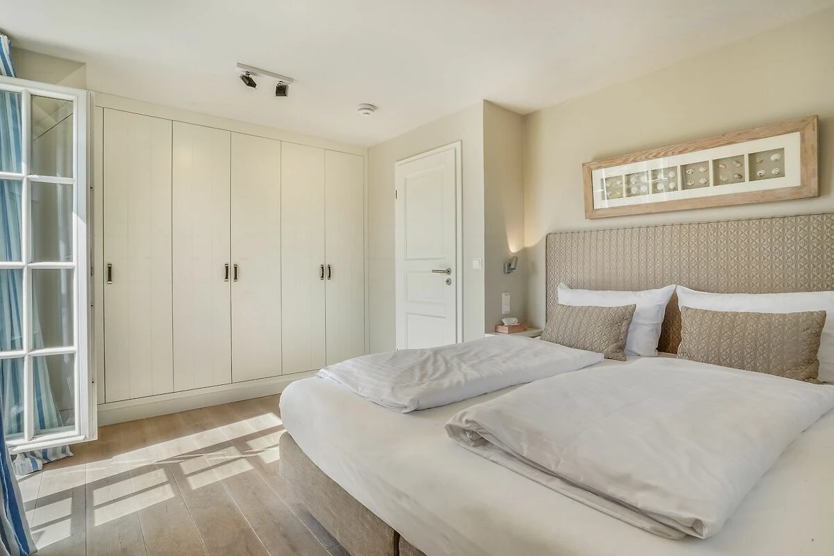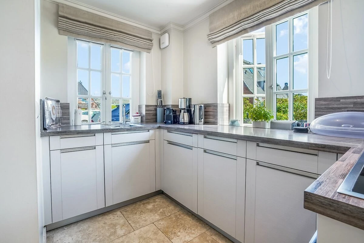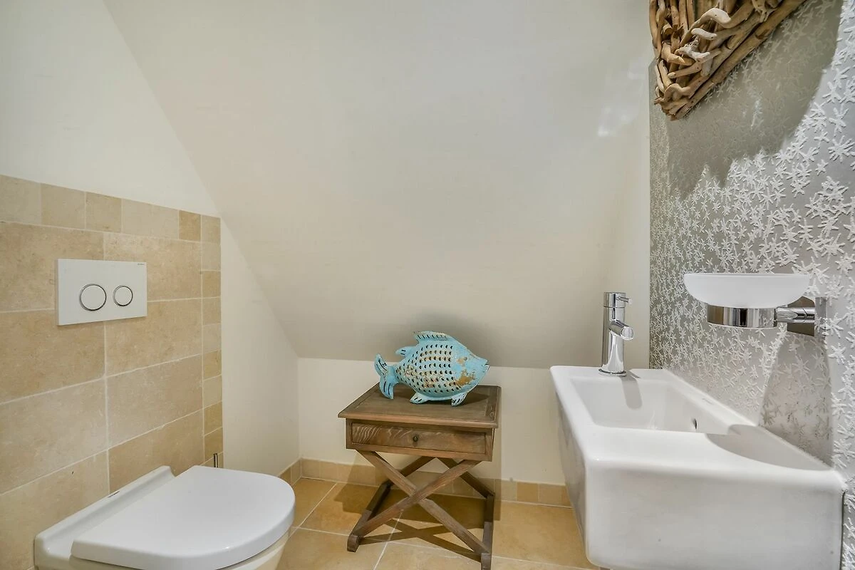 Im Erdgeschoss empfängt Sie ein offener Wohn- und Essbereich, der durch seine lichtdurchflutete Gestaltung besonders freundlich und einladend wirkt. Die voll ausgestattete hochwertige Küche mit Weinkühlschrank ist harmonisch in den Raum integriert - ideal für gemeinsames Kochen und gesellige Abende. Der gemütliche Wohnbereich mit Kamin lädt zum Entspannen ein. Von hier gelangen Sie direkt auf die Terrasse mit eigenem kleinem Gartenstück, Gartenmöbeln und Strandkorb (April – Oktober). Ihre Fahrräder können bequem an den vorhandenen Fahrradständern im Garten abgestellt werden.