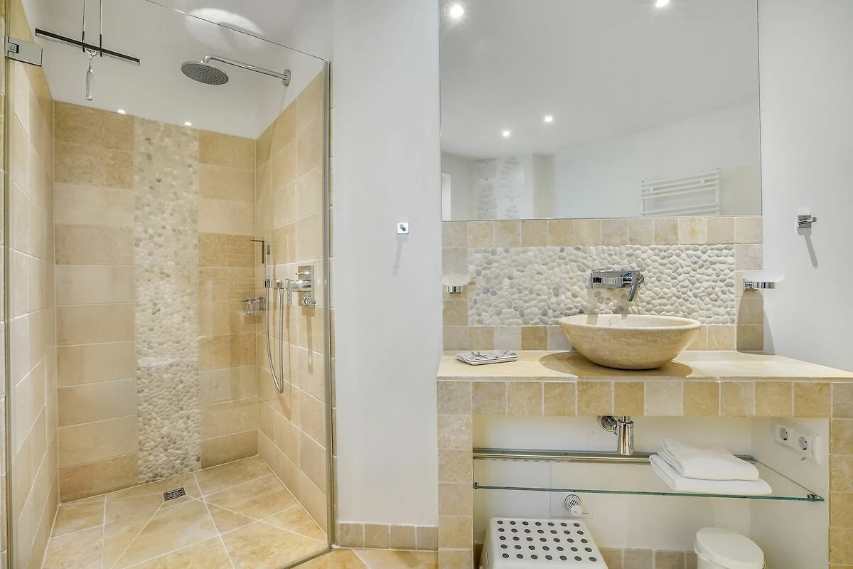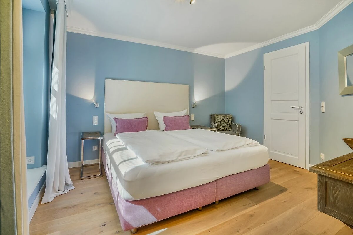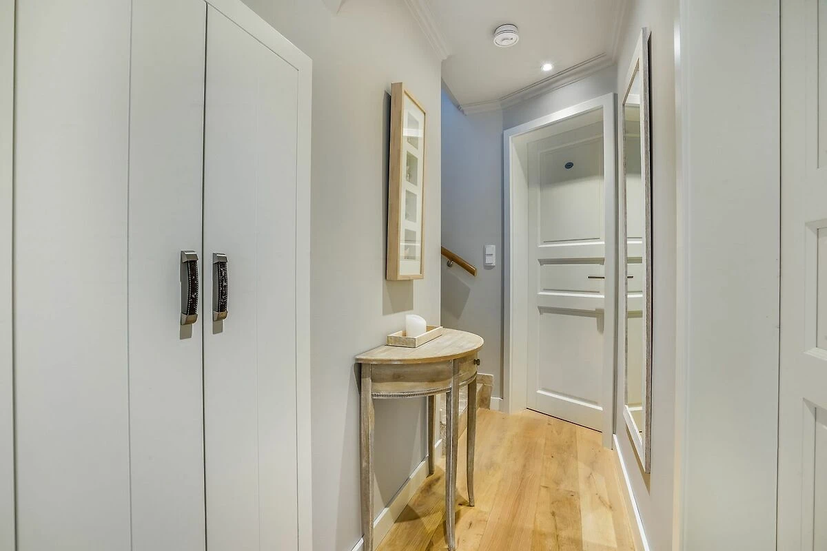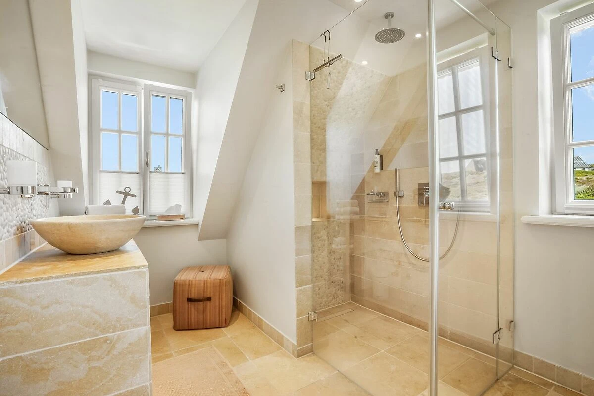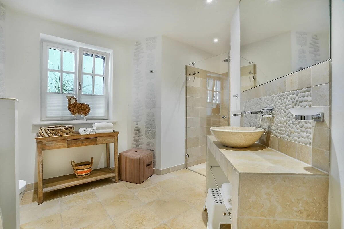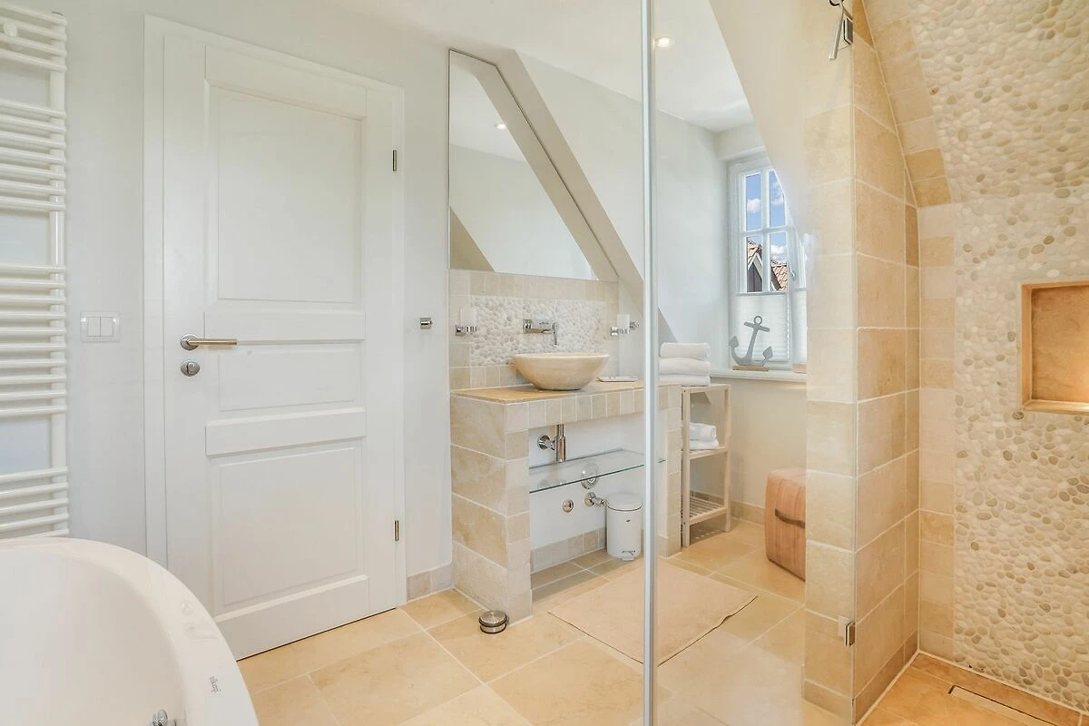 Im Obergeschoss erwartet Sie ein stilvolles Schlafzimmer mit Doppelbett und eigenem Balkon. Das großzügige Badezimmer mit freistehender Badewanne, ebenerdig begehbarer Dusche, hochwertigen Natursteinfliesen und Fußbodenheizung bietet besonderen Komfort. Ein separates WC befindet sich ebenfalls auf dieser Ebene. Im Dachgeschoss liegt ein weiteres Schlafzimmer mit zwei Einzelbetten - ideal für Kinder. Im Souterrain befinden sich zusätzlich ein geräumiges und gemütliches Schlafzimmer mit komfortablem Doppelbett sowie ein ebenfalls großzügiges Tageslichtbad mit WC, einer ebenerdig begehbaren Dusche und Fußbodenheizung. Hier ist zudem ein Wäschetrockner aufgestellt. Eine Waschmaschine befindet sich in einem kleinen separaten Raum unter der Treppe.