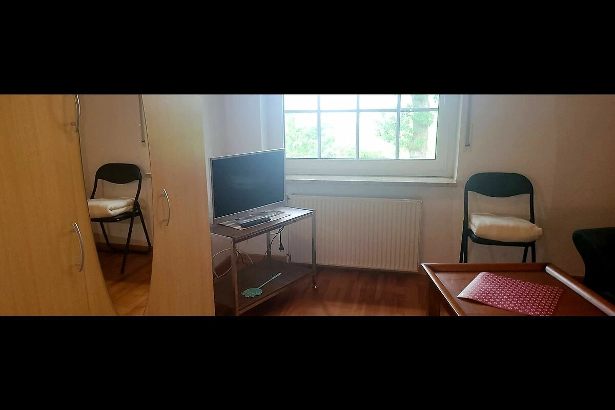 Monteurzimmer für Nichtraucher mit Einzelbett für 1 Person. Sessel, Tisch und Flachbild-TV.