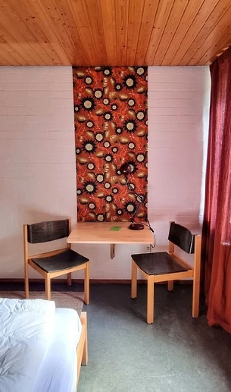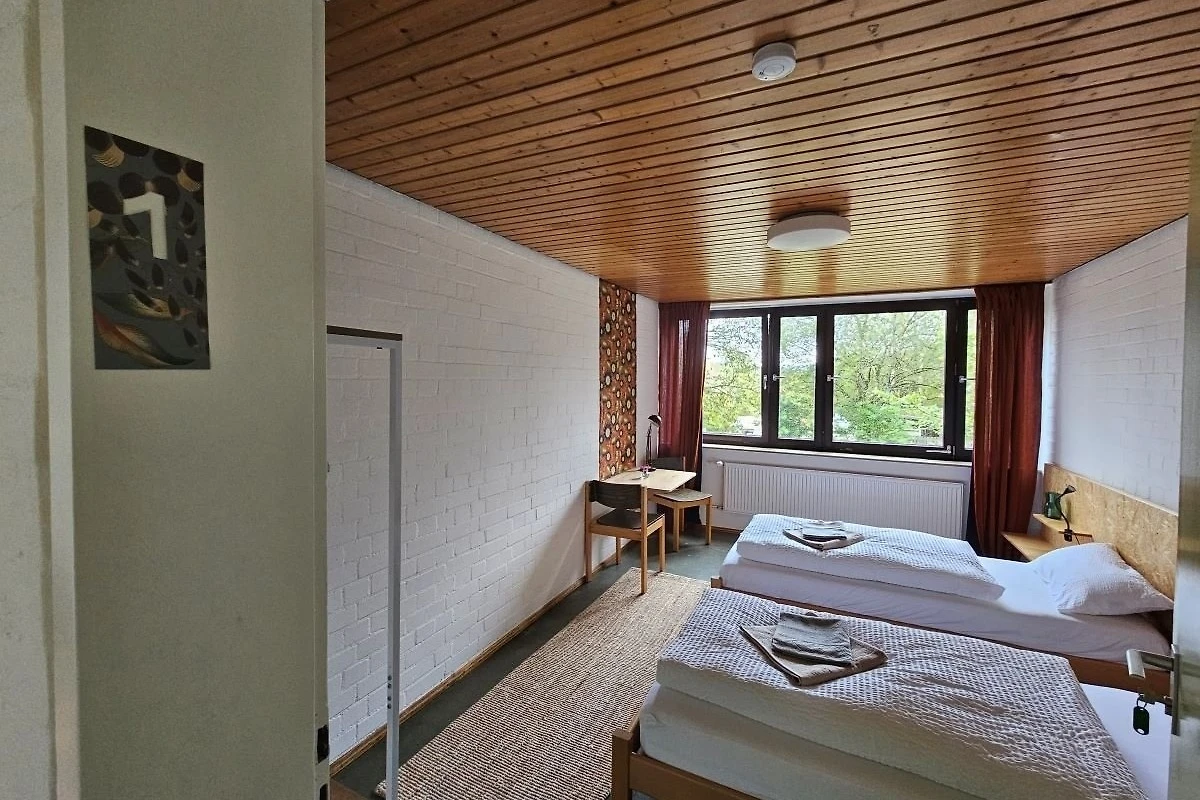 Dieses Zimmer verfügt über 2 getrennte Betten, welche man auch zusammenstellen kann. Ein eigener LAN-Anschluss und WLAN sind vorhanden. Ein Gemeinschaftsbad mit 2 Duschen und 2 Toiletten liegen auf der selben Etage, 2 weitere Bäder einen Stock tiefer.