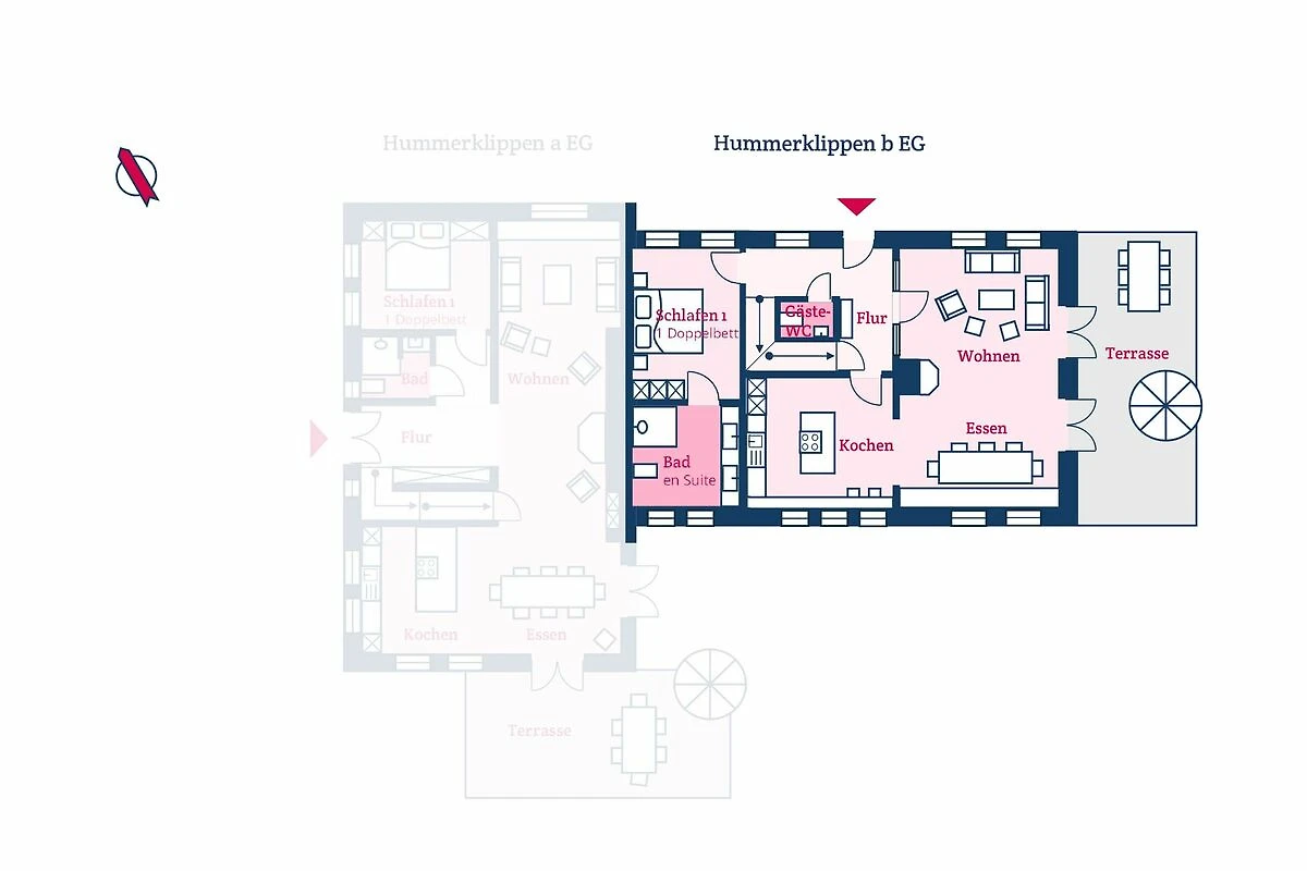 Der reetgedeckte Ferienhausteil Hummerklippen b verfügt über 3 Schlafzimmer und 3 Bäder und bietet somit komfortabel Platz für bis zu 6 Personen zuzüglich einer Kleinkinderaufbettung.