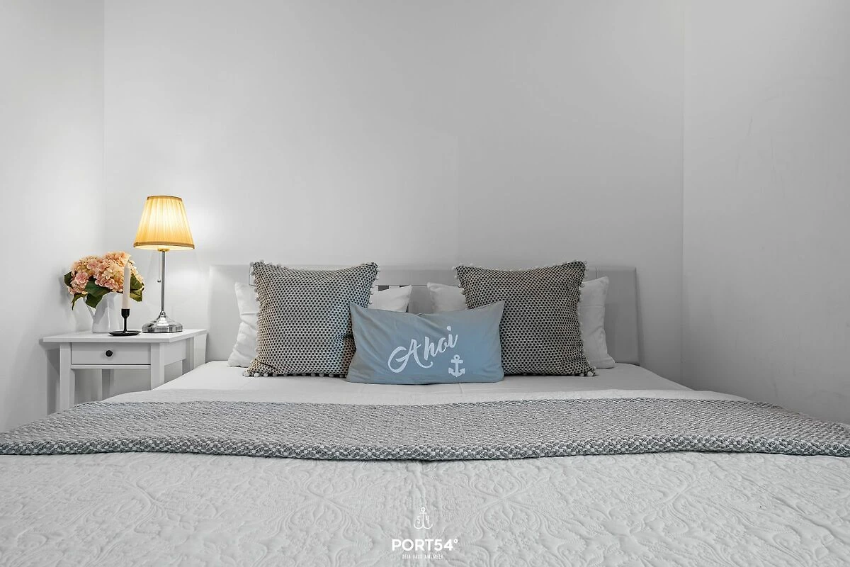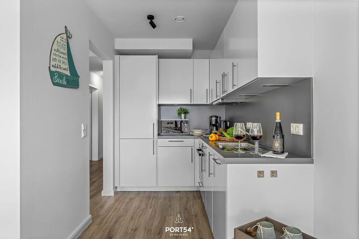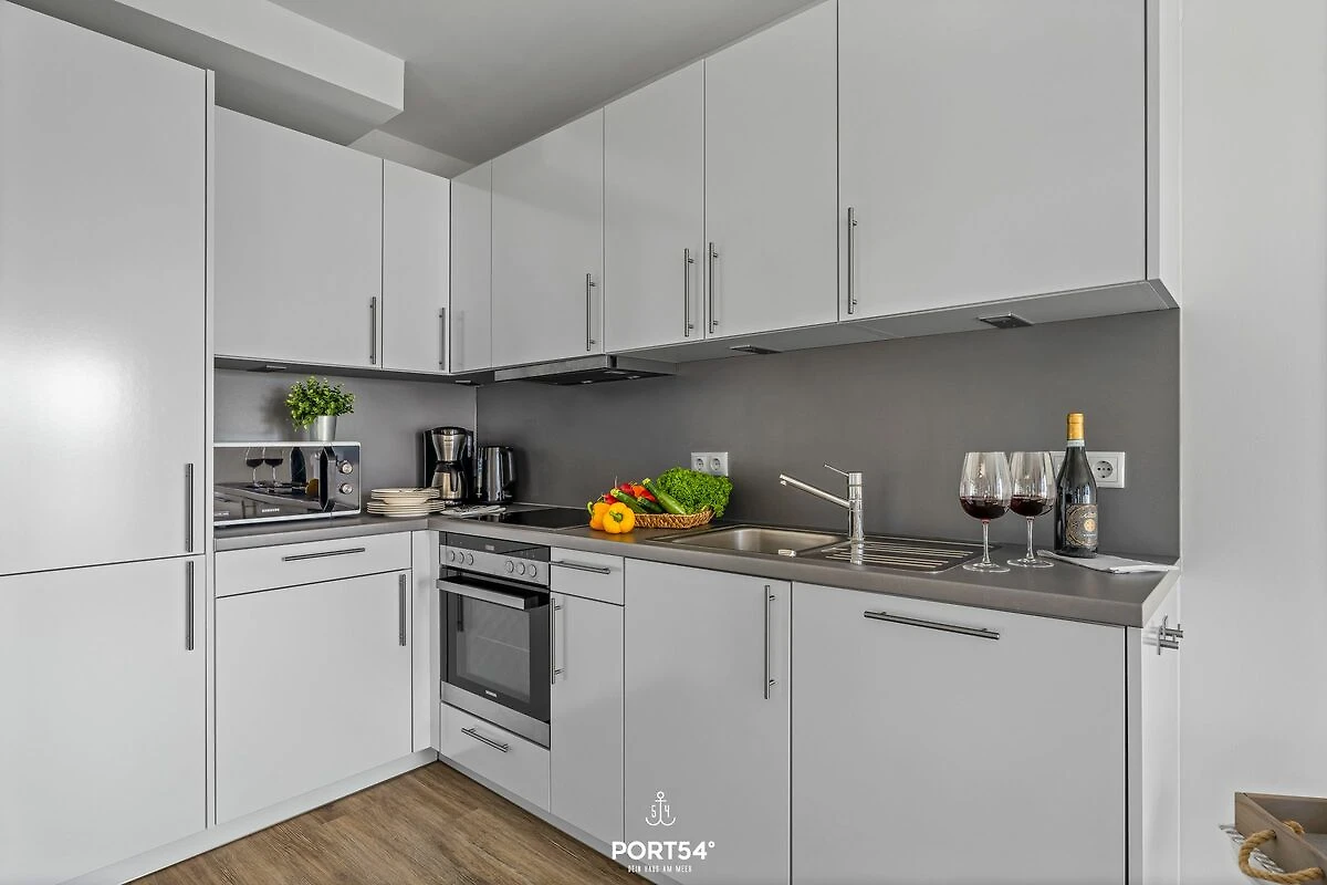 Die Wohnung verfügt über zwei separate Schlafzimmer, die ruhige Rückzugsmöglichkeiten und angenehmen Schlafkomfort bieten. Im offenen Wohn- und Essbereich lädt ein gemütliches Sofa zum Entspannen ein. Der Esstisch ist ideal für gemeinsame Mahlzeiten, die Sie in der voll ausgestatteten Küche zubereiten können. Hier stehen Ihnen neben Backofen, Ceranfeld und Geschirrspülmaschine auch eine Kaffeemaschine, Mikrowelle, Wasserkocher, Toaster und ein extra Gefrierschrank zur Verfügung. Küchenutensilien, Geschirr und Besteck sind selbstverständlich in ausreichender Zahl vorhanden.