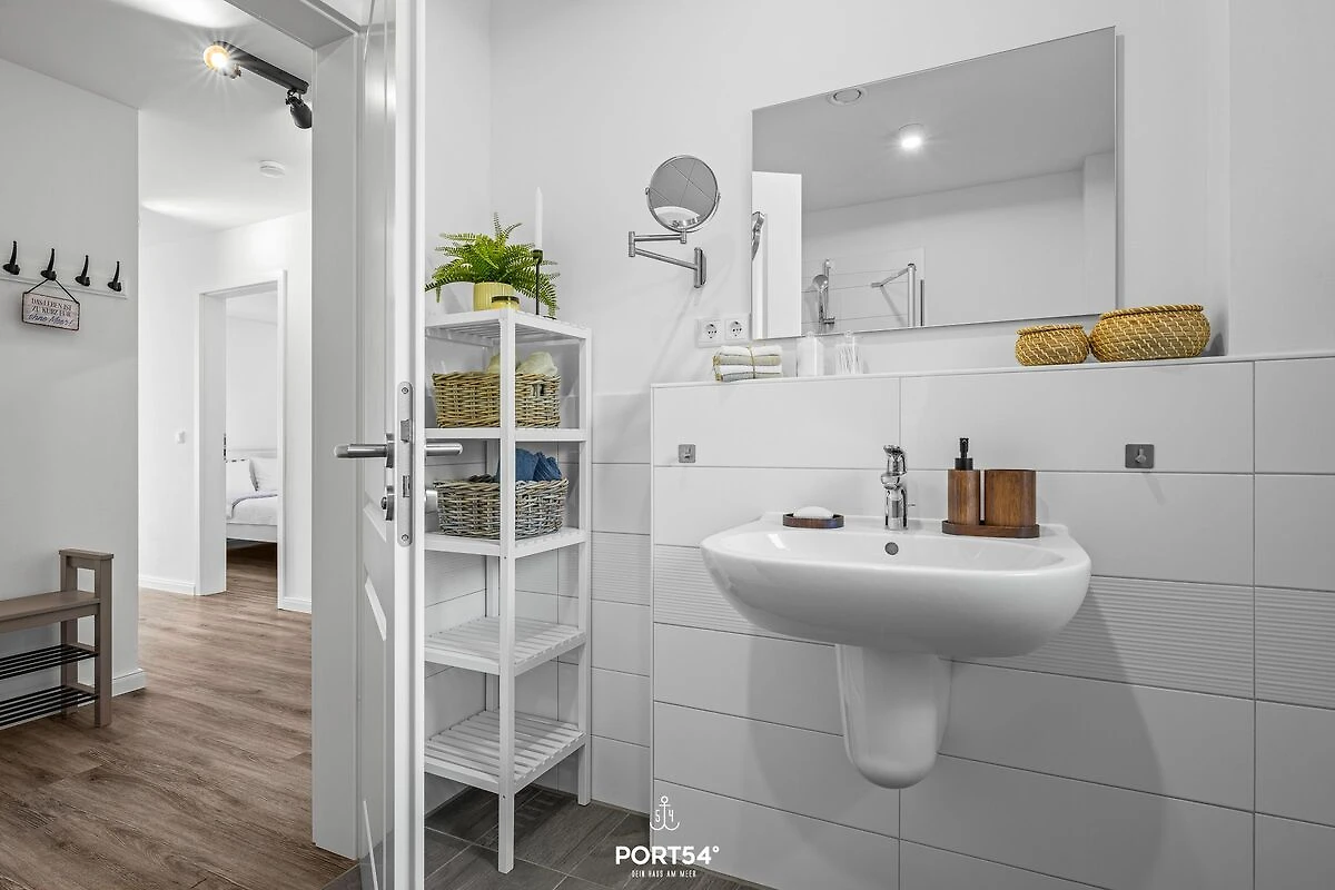 Das moderne Bad ist mit einer bodengleichen Dusche, Waschbecken sowie Kosmetikspiegel und Haartrockner ausgestattet. Auch Badetücher und Bettwäsche sind Teil der Erstausstattung. Fußbodenheizung und Zentralheizung gewährleisten angenehme Temperaturen zu jeder Jahreszeit.