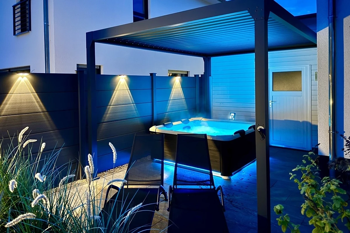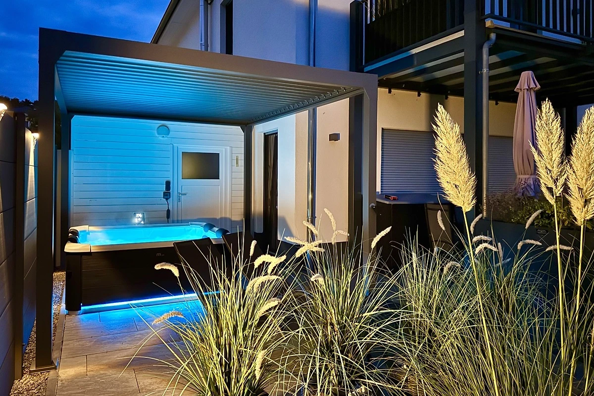 Über den hellen Flur mit Garderobe und Schuhschrank gelangen Sie über eine Glastür in das große Wohnzimmer. Dort gibt es eine ausziehbare Schlafcouch, einen großen Essbereich für 8 Personen sowie die offene Traumküche mit Induktion und Geschirrspüler. Genießen Sie lauschige Abende am modernen Kamin mit Eckverglasung oder dem großen Smart-TV mit Dolby-Surroundanlage. Über die 4 Meter breite Glasfront gelangen Sie auf die über 40 m² große, teils überdachte Terrasse, auf der sich ein Essplatz für 8 Personen, zwei Sonnenliegen, zwei Sonnenschirme, eine Lamellen-Pergola und eine Auflagenbox befinden. Hier stehen auch, je nach Saison, die Solardusche und der Whirlpool.