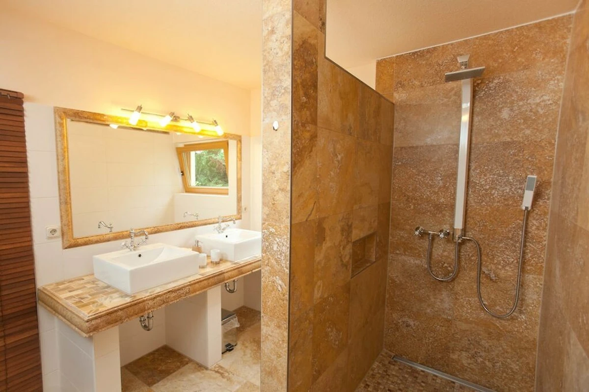 Und das absolute Highlight ist das Naturstein-Badezimmer. Hier haben wir besonderen Wert auf exklusive Materialien gelegt. Ein modernes und hochwertiges Bad mit türkischem Travertin in Gold und italienischem Marmor.