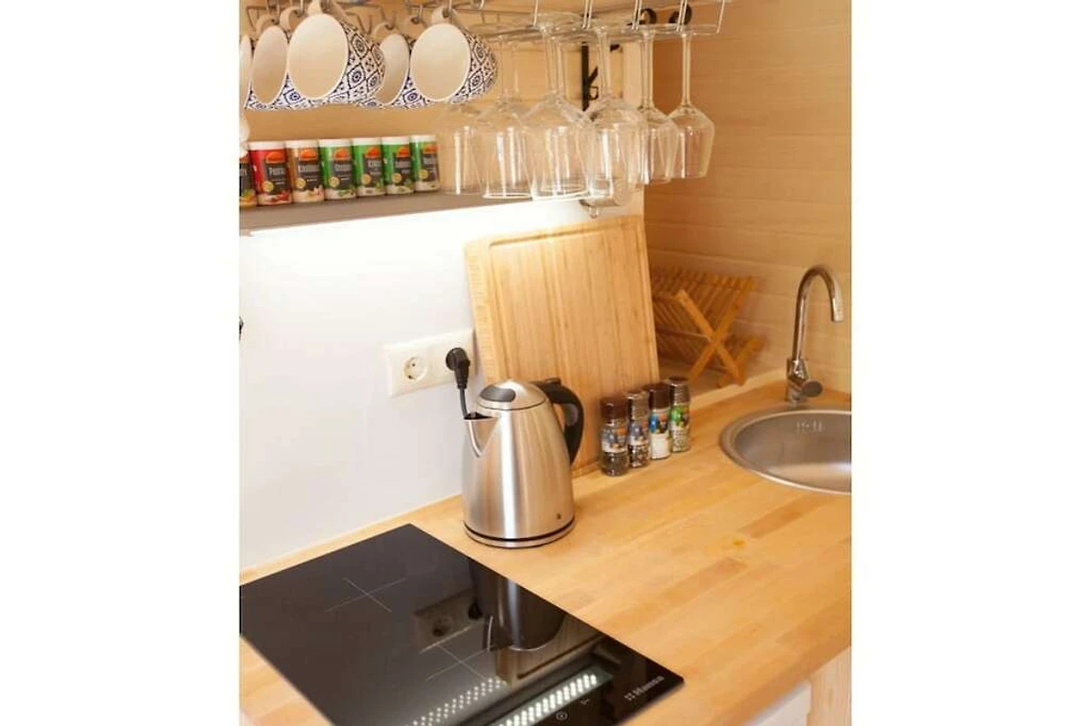 Parterre: (Wohnzimmer(, TV, TV, Herd), Esszimmer(TV, Esstisch), Küche(Kochplatte, Backofen, Kühlschrank), Schlafzimmer(Doppelbett, Babybett), Badezimmer(, Toilette, Dusche, Waschbecken))