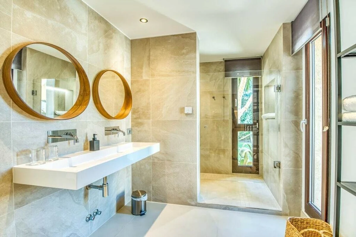 Die Schlafzimmer sind alle klimatisiert, der offene, loftartige Living/Dining Room hat bis zu 7,50m hohe Decken. Die Badezimmer haben jeweils Walk-In Duschen, 3 von ihnen sogar eine Badewanne. In der Küche erwarten Sie sowohl Gas- als auch Induktionskochfelder, dazu natürlich Backofen, Dampfgarer und ein Kaffeevollautomat – komplett von Siemens. Und der Grill - ein großer Gas Grill steht auf der überdachten Terrasse – bitte schön. Für die Zutaten und die coolen Drinks gibt´s NATÜRLICH eine große Double-Side Kühl-Gefrier-Kombination – wer will macht sich seine Eiswürfel selbst…Dazu kommt eine klassische Barausstattung. Wir eröffnen die Bar zum Saisonbeginn mit einer Getränkeauswahl nach unserem Geschmack. Unsere Gäste bringen dann über den Sommer das mit ein, was sie selbst ausgetrunken haben und was sie lieben, aber vielleicht noch fehlt. Dann wird die Bar an den nächsten Gast übergeben und so weiter. Das nennen wir give and take…bei der jeder seine persönliche Visitenkarte hinterlässt - pur, gemixt, als Cocktail oder eiskalt on the rocks.