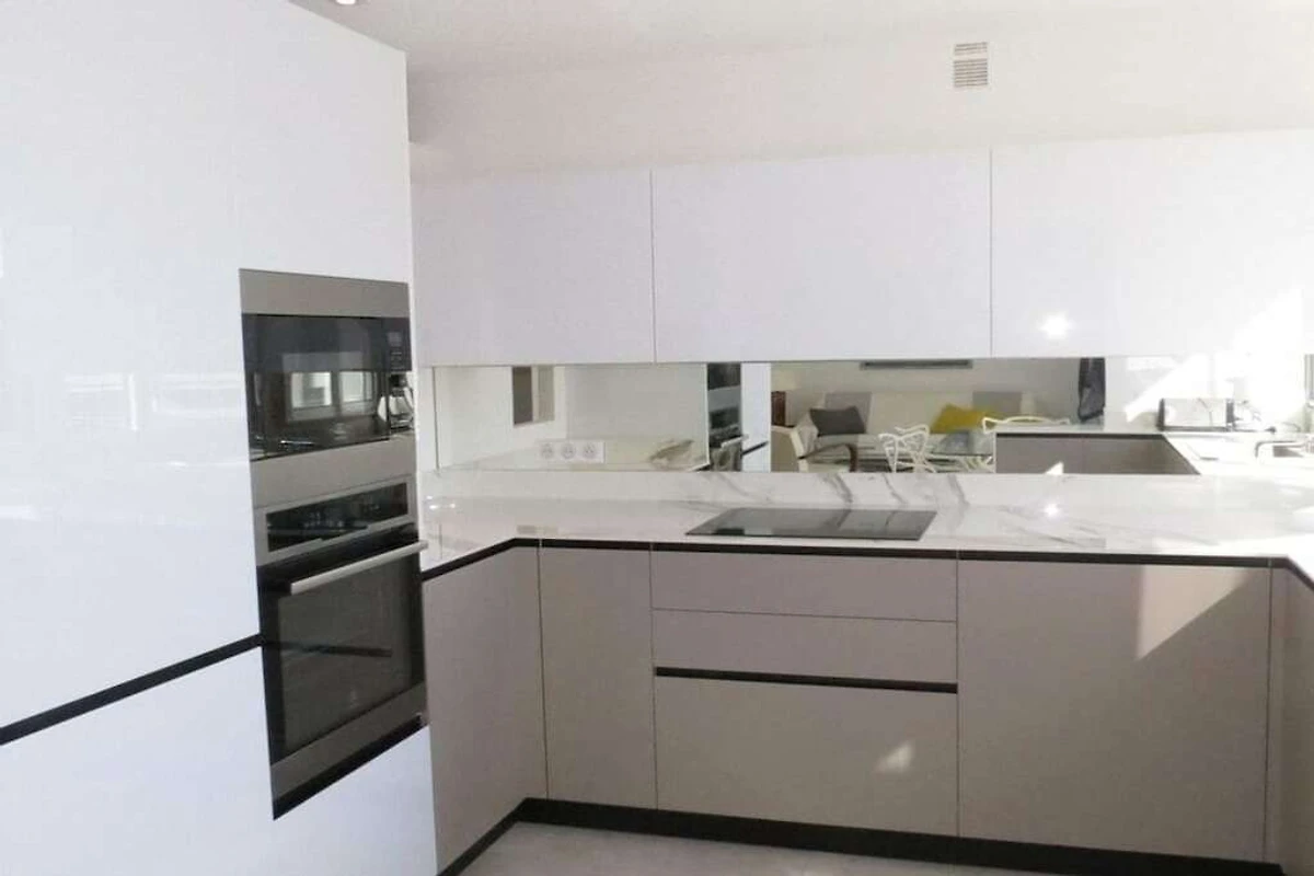 Die amerikanische Küche ist top ausgestattet mit Induktionsherd, Backofen und Kühlschrank sowie Geschirrspülmaschine und Waschmaschine.