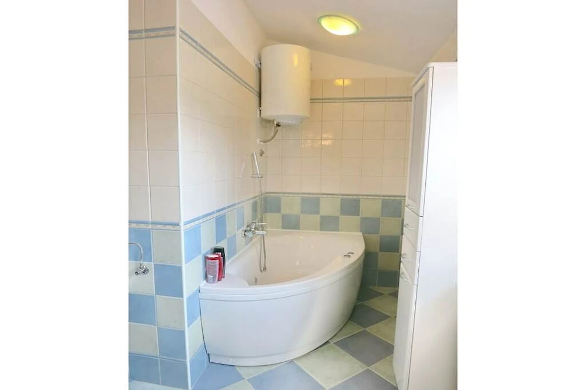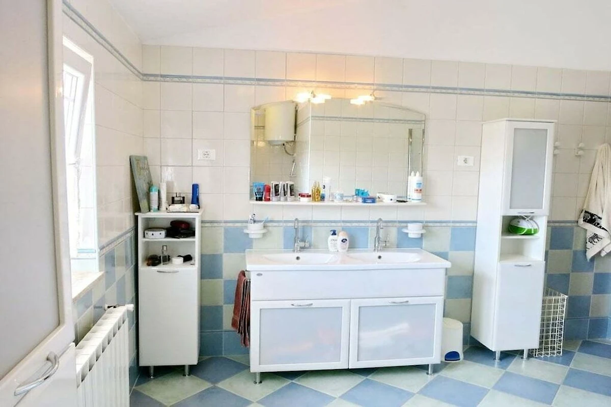 In der 1. Etage: (Schlafzimmer(, , Doppelbett, Doppelbett, TV), Kinderzimmer(, Einzelbett, Einzelbett), Badezimmer(, Toilette, Badewanne, Dusche, Waschbecken, Waschbecken, Bidet))