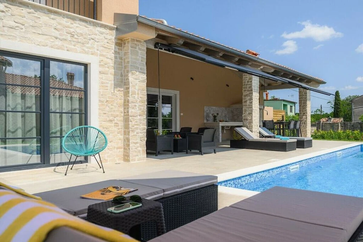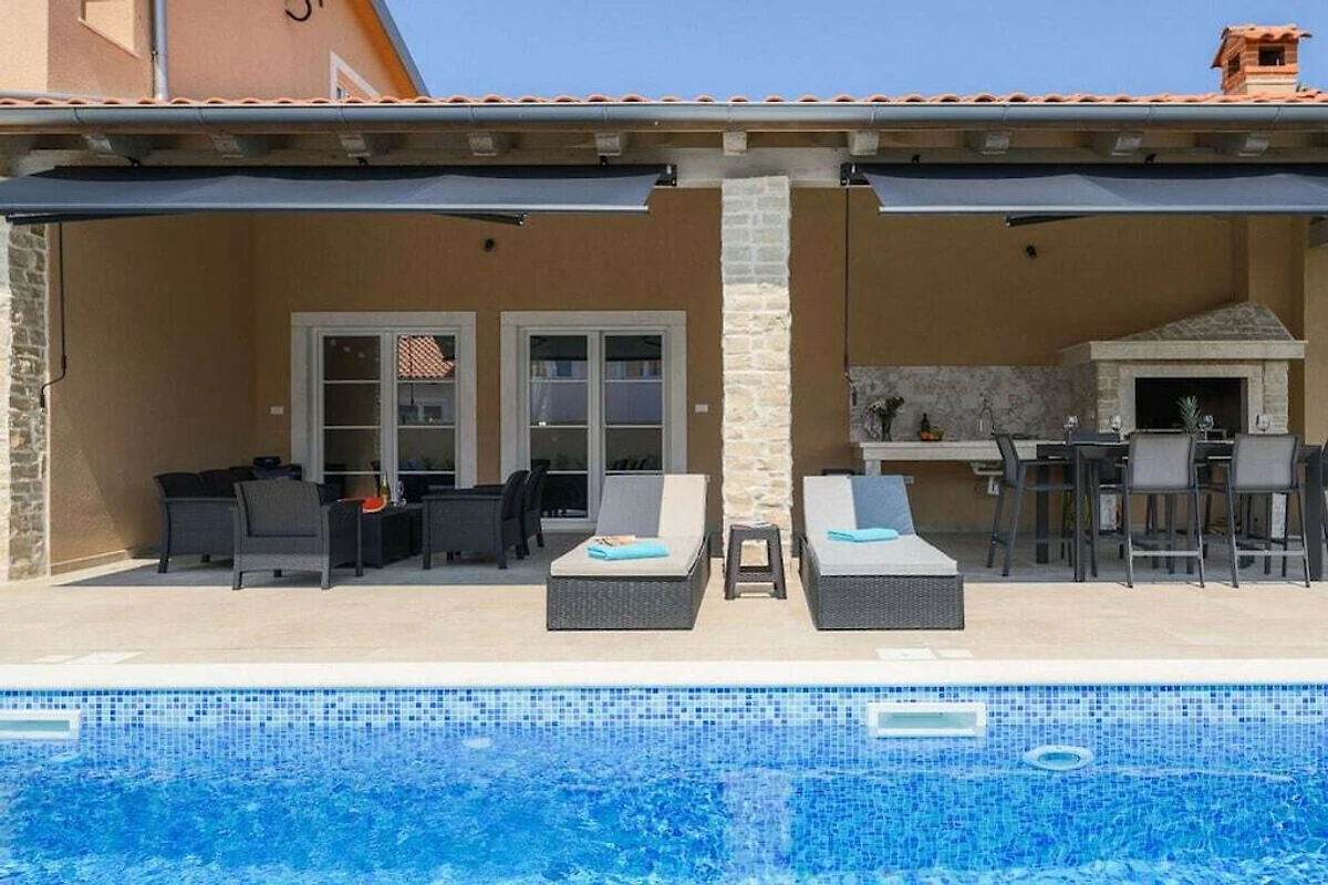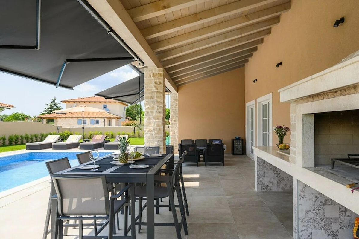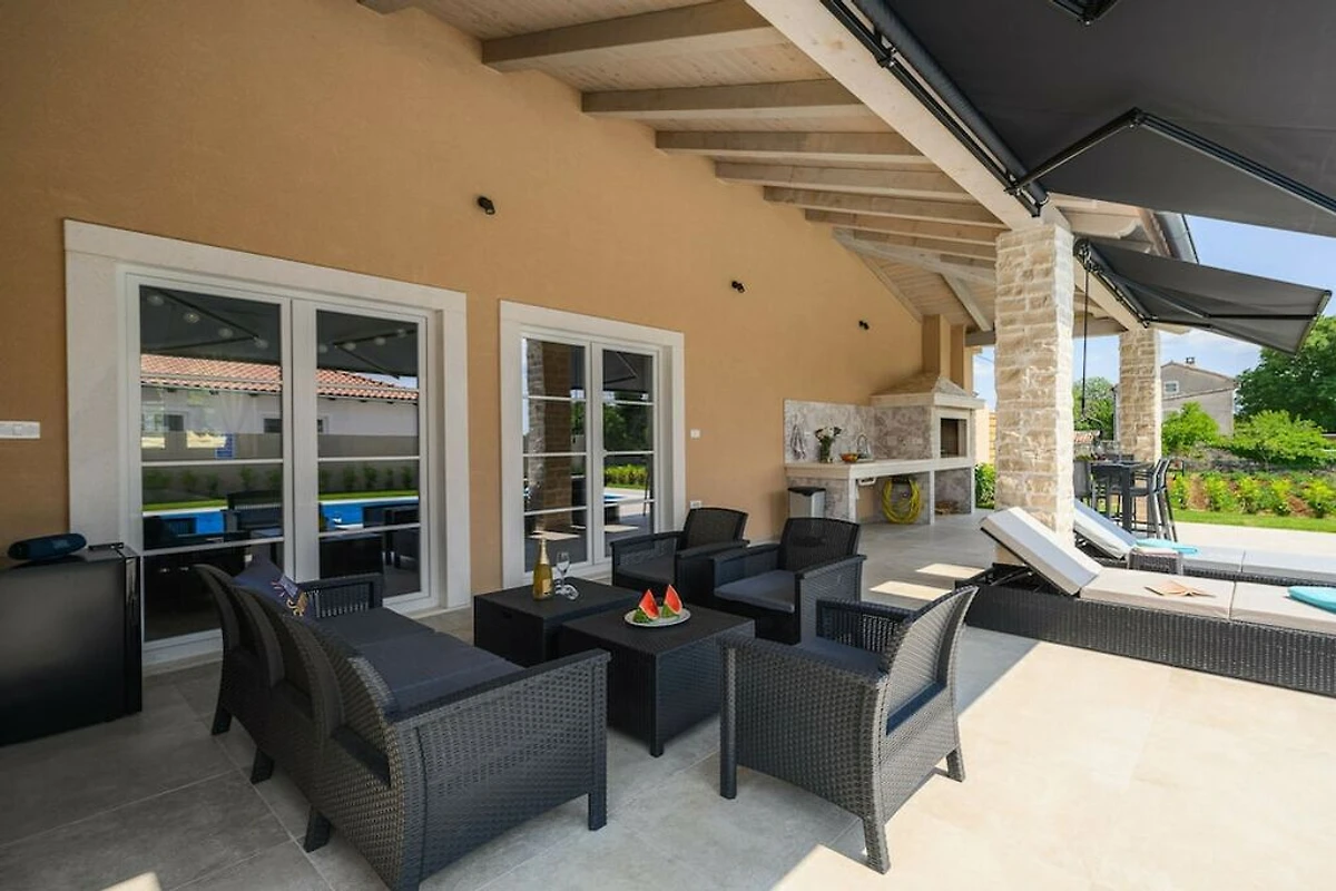 Im Erdgeschoss gibt es auch eine kleine Toilette. Im Obergeschoss gibt es ein weiteres offenes Zimmer mit einem Doppelbett und einem Balkon mit Blick auf den Pool und den Garten. Es gibt ein großes, modernes Badezimmer mit Dusche und Badewanne. Der große Außenbereich verfügt über eine Außenküche mit einem großen Grill und ist ideal, um Abendessen im Freien am Pool und ein Glas exquisiten istrischen Weins zu genießen.