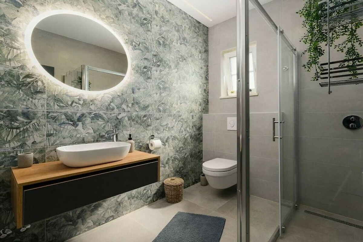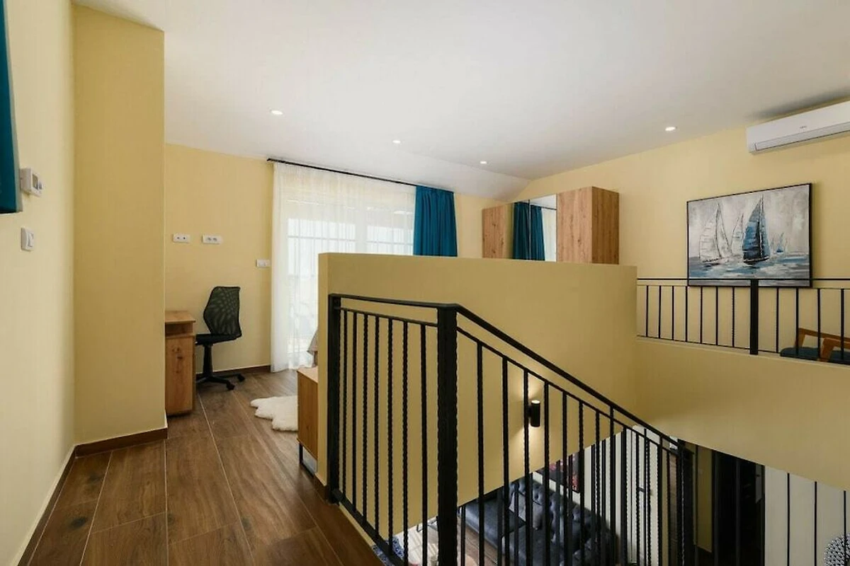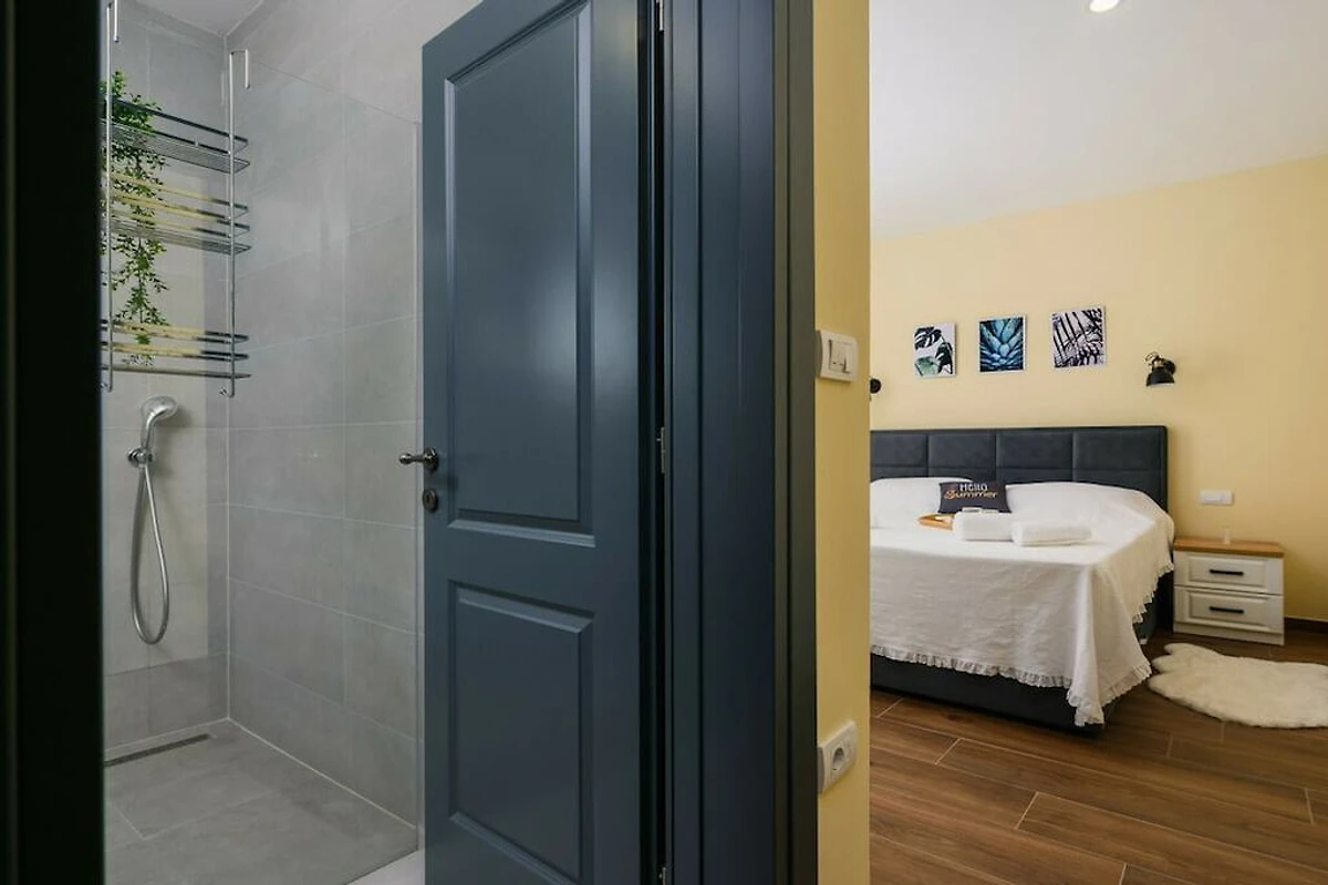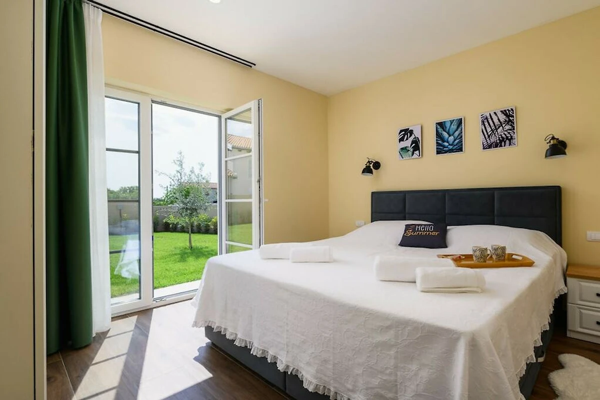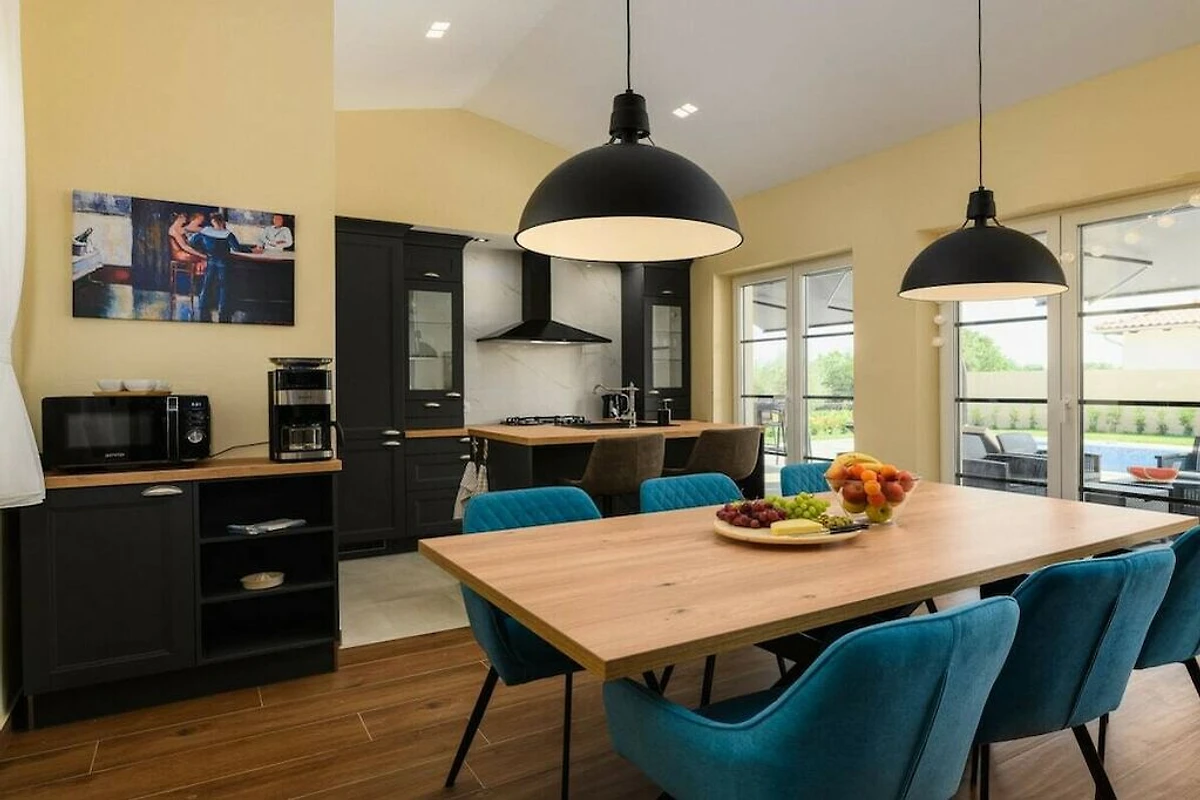 Im Erdgeschoss gibt es auch eine kleine Toilette. Im Obergeschoss gibt es ein weiteres offenes Zimmer mit einem Doppelbett und einem Balkon mit Blick auf den Pool und den Garten. Es gibt ein großes, modernes Badezimmer mit Dusche und Badewanne. Der große Außenbereich verfügt über eine Außenküche mit einem großen Grill und ist ideal, um Abendessen im Freien am Pool und ein Glas exquisiten istrischen Weins zu genießen.