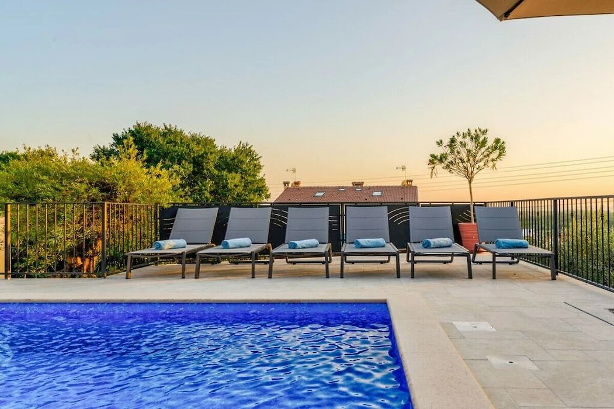 Es besteht aus einem Wohnzimmer, einem Esszimmer, einer Küche und einem Badezimmer mit Dusche im Obergeschoss sowie zwei Schlafzimmern mit Doppelbetten und einem Badezimmer mit Dusche im Erdgeschoss. In einem der Schlafzimmer kann das Doppelbett in zwei Einzelbetten umgewandelt werden. Das Hauptmerkmal des Gartens ist der Pool und die Sitzecke davor, aber auch der Strandbereich, ein weiterer Bereich in der Nähe der Schlafzimmer und ein Balkon an der Eingangstür. Jeder ist getrennt, wenn Sie eine ruhige Ecke brauchen, aber dennoch in der Nähe sind.