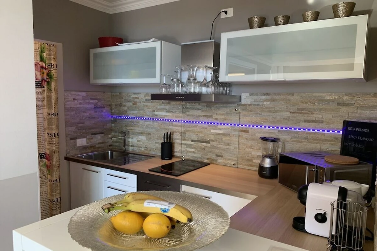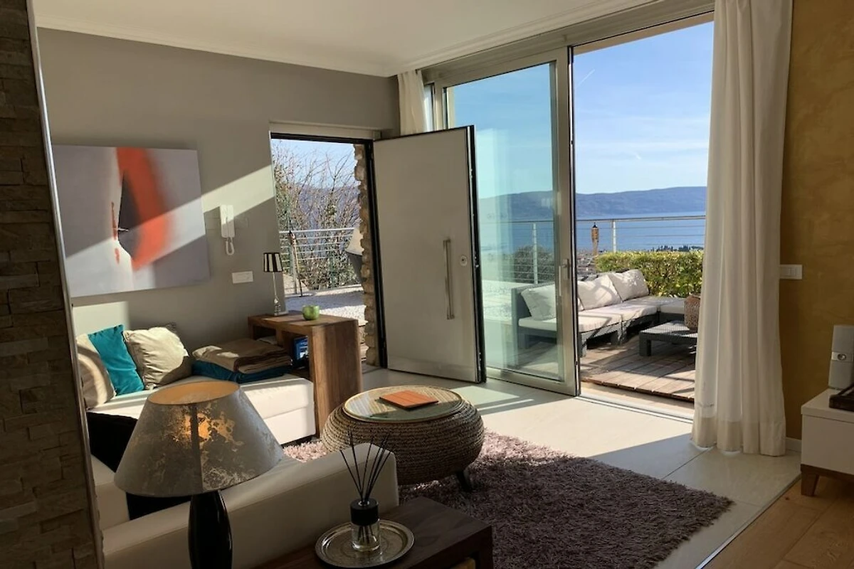 In der Ferienwohnung 1 Maderno gibt es ein großes Schlafzimmer mit Schrank, Doppelbett 160 x 200 cm und Terrasse und Seeblick sowie Smart TV, sowie ein weiteres Schlafzimmer mit Doppelbett 160 x 200 und Smart TV. Die Ferienwohnung befindet sich in einer wertigen, architektonisch außergewöhnlichen und modernen Anlage im Terrassenstiel und in der Form einer Limonaia in Toscolano-Maderno, Hanglage, inmitten eines Olivenhaines.