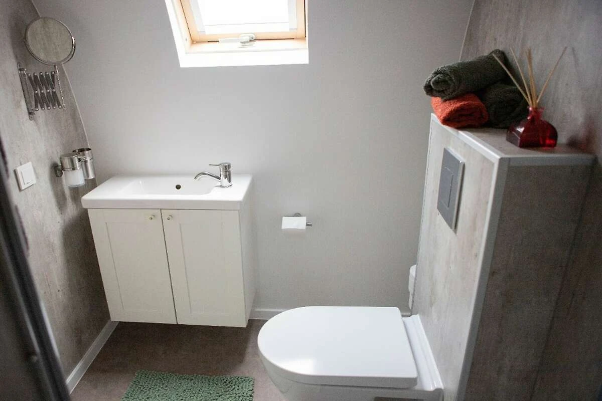 Parterre: (offene Küche(Kochplatte, Dunstabzugshaube, Kaffeemaschine, Kombi-Mikrowelle, Kühl-/Gefrierkombination, , ), Wohn-/Schlafzimmer(Doppelbett oder 2 Einzelbetten, TV, Esstisch, Sitzecke), Badezimmer(Dusche, Waschbecken, Toilette))