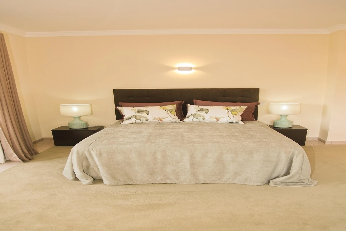 Von den Schlafzimmern im Erdgeschoss gelangen Sie durch Fenstertüren direkt auf die Terrasse mit Liegestühlen und Sonnenschirmen am Pool. Die Schlafzimmer im 1. Stock haben einen eigenen Balkon mit bequemen Stühlen. Alle Schlafzimmer verfügen über begehbare Kleiderschränke, Klimaanlage und geräumige Badezimmer mit Massagebadewanne. Das Schlafzimmer verfügt über einen TV und einen Safe.