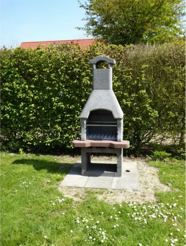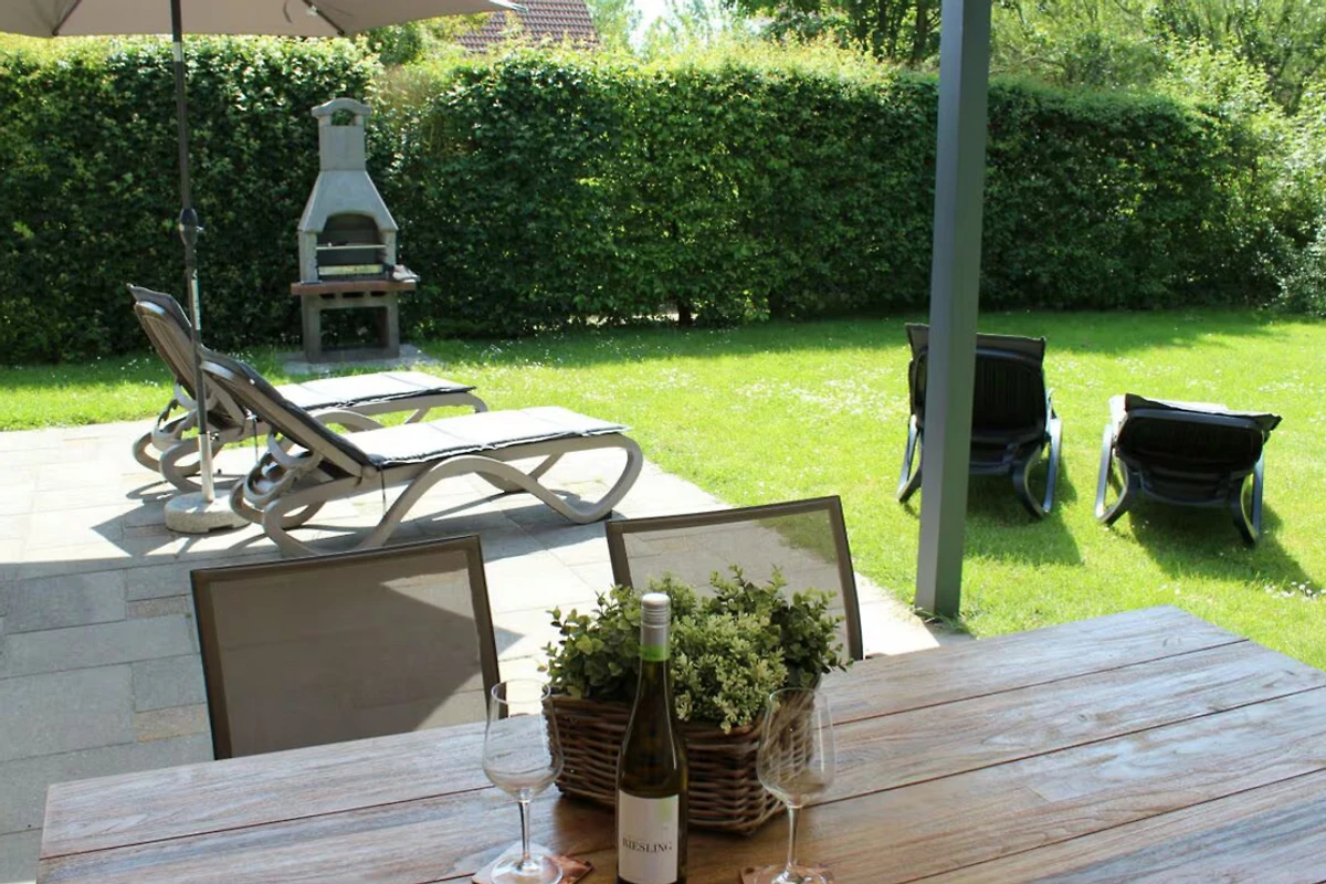 Moderne neue Gartenmöbel, samt Holzkohlgrill und ein großer Sonnenschirm runden den Garten ab.