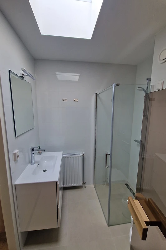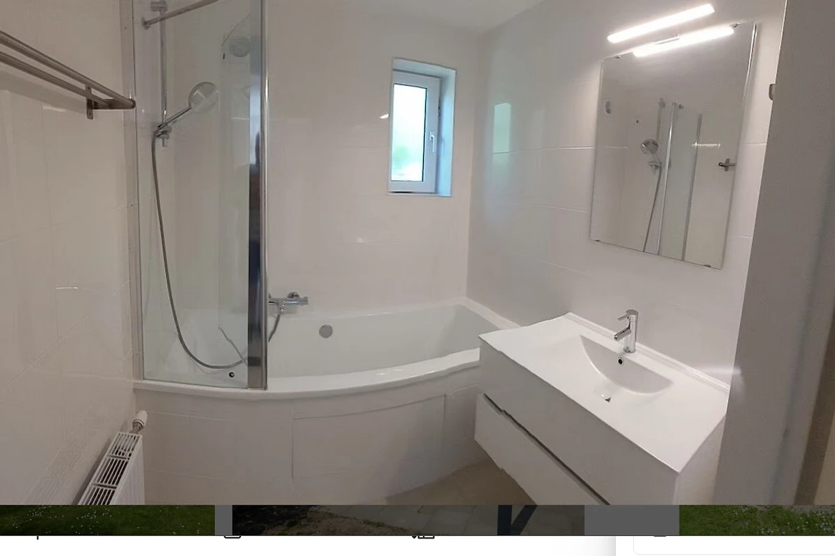 Badezimmer mit Badewanne, separates WC, geräumiges Schlafzimmer und Abstellraum (Waschmaschine, Trockner, Bollerwagen, 3 Erwachsenen-Fahrräder, 1 Kinderfahrrad).