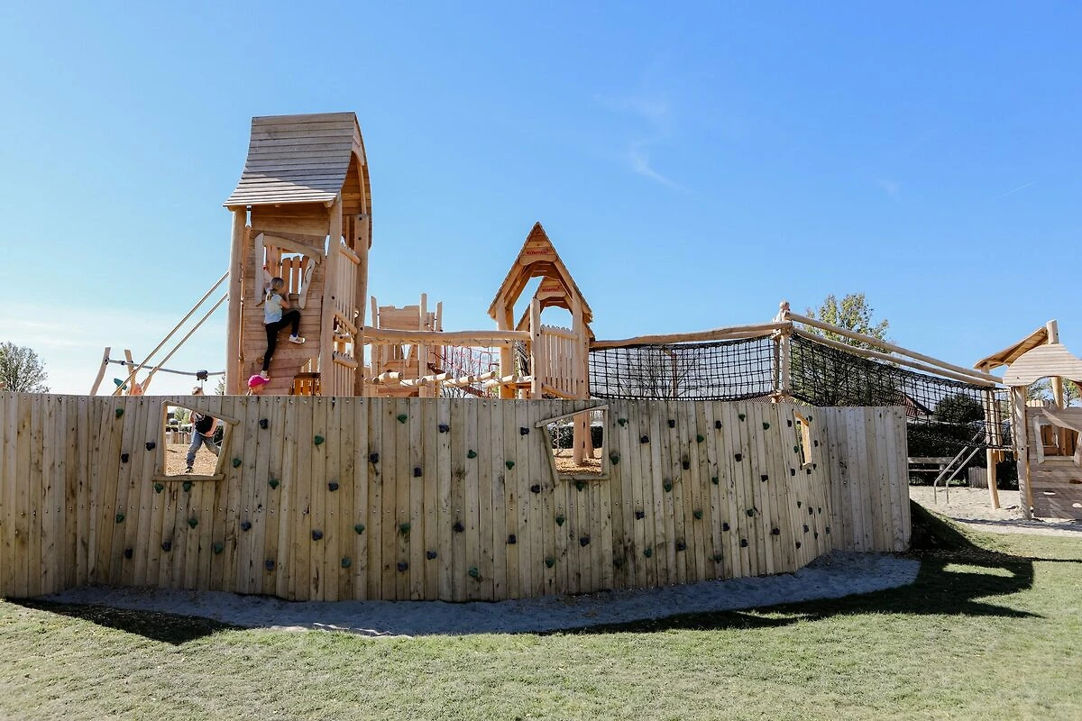 zwei große Outdoorspielplätze, viele kleine Spielplätze über den Platz verteilt, Indoorspielplatz