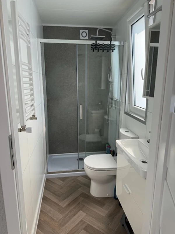 * Badezimmer mit großer Regendusche und Handtuchwärmer, Spiegelschrank