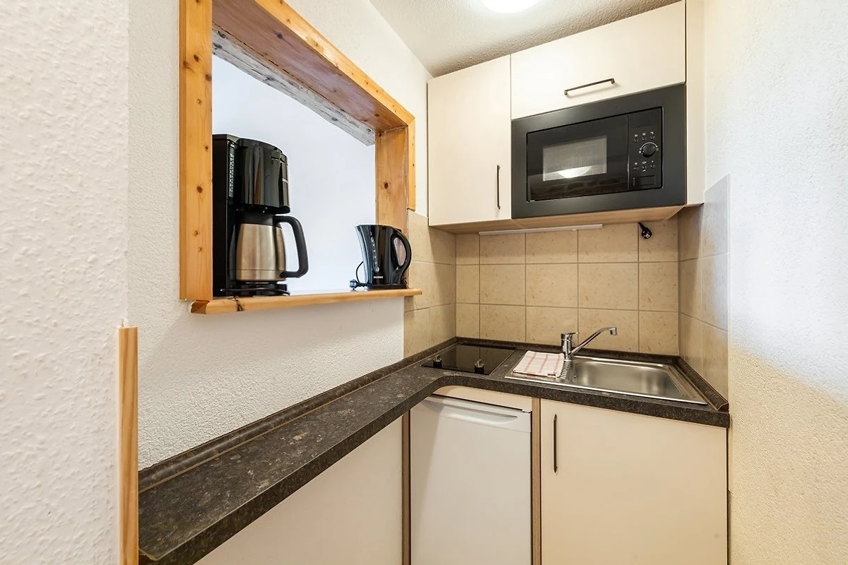 Küchenzeile mit Spüle, Geschirr, Kühlschrank, 2 Herdplatten