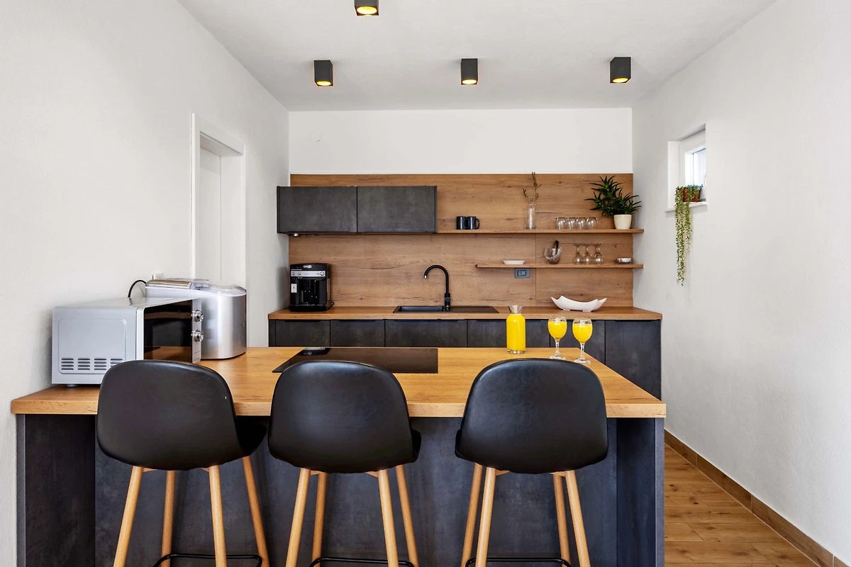 Die Villa ist mit 7 gut gestalteten Badezimmern ausgestattet, darunter 6 mit Duscheinrichtungen und 1 zusätzliche Toilette, was allen Gästen reichlich Komfort bietet. Die moderne amerikanische Küche ist ein Traum für Kochbegeisterte und verfügt über hochwertige Geräte, einschliesslich einer Glaskeramik-Kochplatte, Kühlschrank, Gefrierschrank, Backofen, Mikrowelle, Geschirrspüler, Kaffeemaschine und umfangreichem Küchengeschirr.