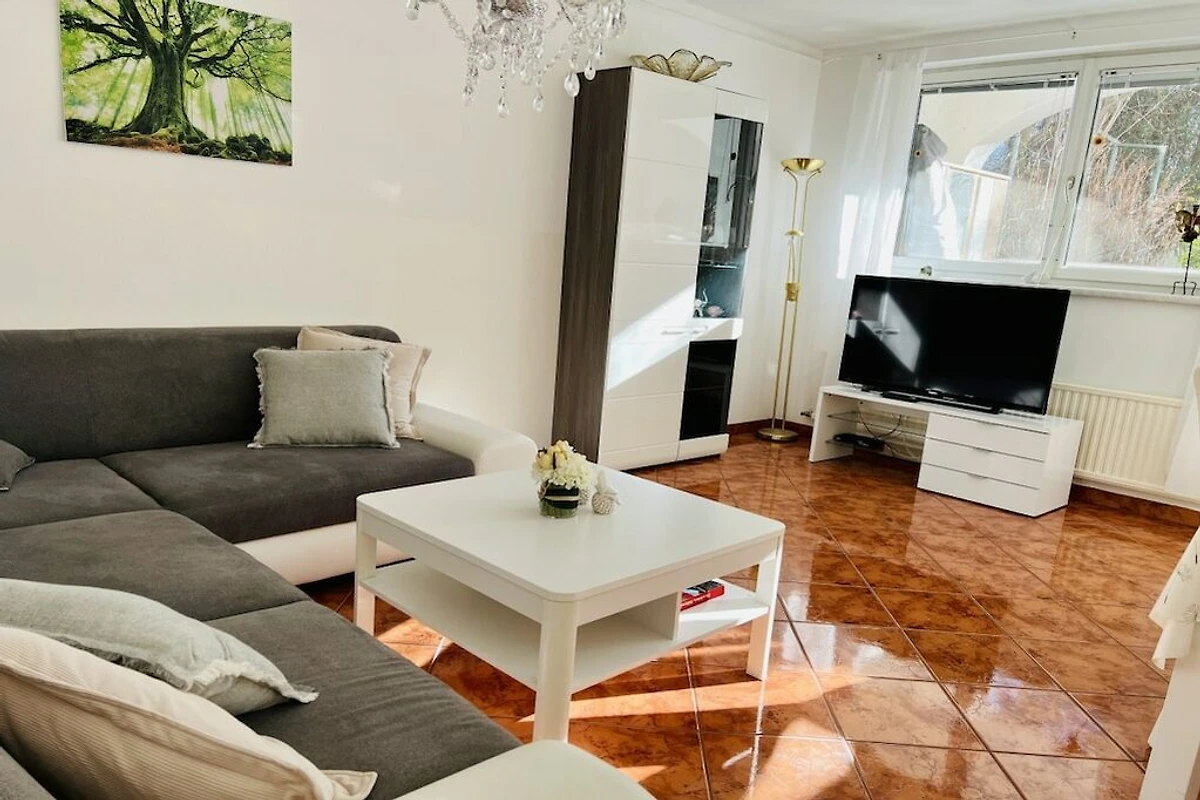 Wohnzimmer mit ausziehbarer Couch, Tisch mit 4 Stühlen und SatTV