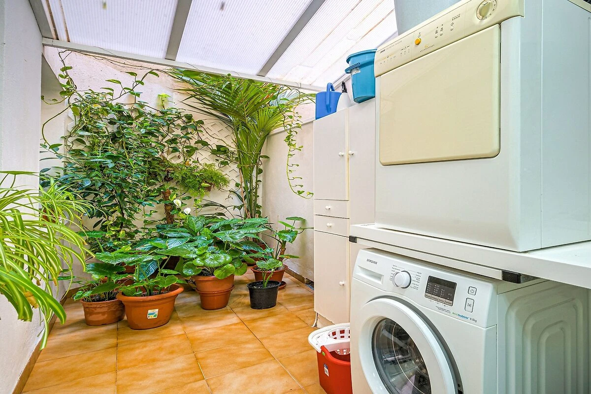 Parterre: (Küche(Kochplatte, Wasserkocher, Toaster, Kaffeemaschine, Backofen, Mikrowelle, Spülmaschine, Kühl-/Gefrierkombination, Zitruspresse, Mixer), Wohn/Esszimmer(Schrankbett 1 Person, TV, Esstisch, Sitzecke, Balkon oder Terrasse), Schlafzimmer(Doppelbett, Babybett), Schlafzimmer(Einzelbett, Einzelbett), Schlafzimmer(Einzelbett, Einzelbett), Badezimmer(Badewanne mit Dusche, Waschbecken, Toilette, Bidet, Bügeleisen, Föhn), Badezimmer(Dusche, Waschbecken, Toilette), Waschraum(Trockner, Waschmaschine), Abstellraum)