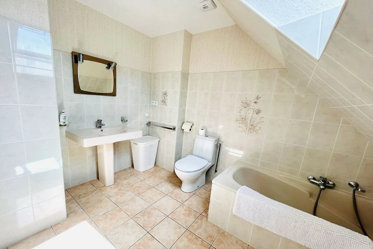 In der 1. Etage: (Wohnzimmer(Gesellschaftsspiele), Esszimmer(Esstisch), Schlafzimmer(Einzelbett, Doppelbett), Schlafzimmer(Doppelbett king size), Badezimmer(Badewanne, Waschbecken, Toilette), Badezimmer(Dusche, Waschbecken, Toilette))