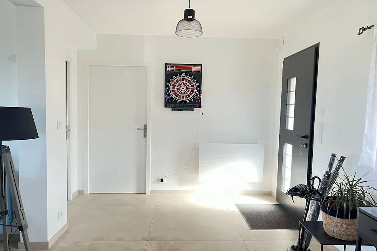 Parterre: (Wohnzimmer(TV, Kaminofen, Stereoanlage, Dart, Gesellschaftsspiele), Küche(Esstisch, Herd, Kochplatte, Wasserkocher, Toaster, Kaffeemaschine, Backofen, Mikrowelle, Spülmaschine, Kühlschrank, Tiefkühlschrank, Waschmaschine, Hochstuhl, Mixer, Küchenmaschine, ), Schlafzimmer(Doppelbett, Dusche, Föhn), Badezimmer(Dusche, Waschbecken), Waschraum(Trockner, Waschbecken, Toilette, Waschmaschine, Bügelbrett, Bügeleisen))