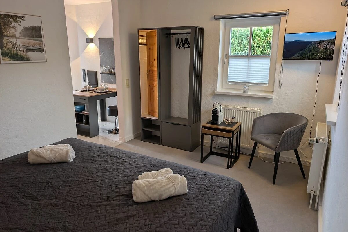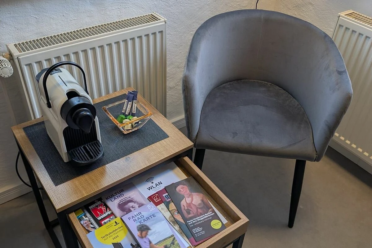 Das Apartment ist komfortabel ausgestattet und bietet alles, was Sie für einen angenehmen Aufenthalt benötigen. Ein hochwertiges 180cm Boxspringbett garantiert erholsamen Schlaf. In der praktischen Küchenzeile stehen Ihnen ein Kühlschrank, zwei Herdplatten sowie eine Basis-Küchenausstattung zur Verfügung. Zusätzlich finden Sie eine Nespresso-Kapselmaschine, einen Toaster und einen Wasserkocher. Am kleinen Essbereich für zwei Personen können Sie gemütlich frühstücken oder den Abend ausklingen lassen. Für entspannte Stunden sorgen ein bequemer Sessel, ein Flachbild-TV sowie ein grosser Kleiderschrank mit Bügeln, Fächern und viel Stauraum. Das Badezimmer verfügt über eine Badewanne mit integrierter Regendusche sowie einen Föhn. Dank Verdunkelungsrollos schlafen Sie ungestört und entspannt. Im Sommer bleibt das Apartment angenehm kühl, während es im Winter gut beheizt werden kann. Aktuelles Informationsmaterial über Worpswede und die Umgebung liegt für Sie bereit.