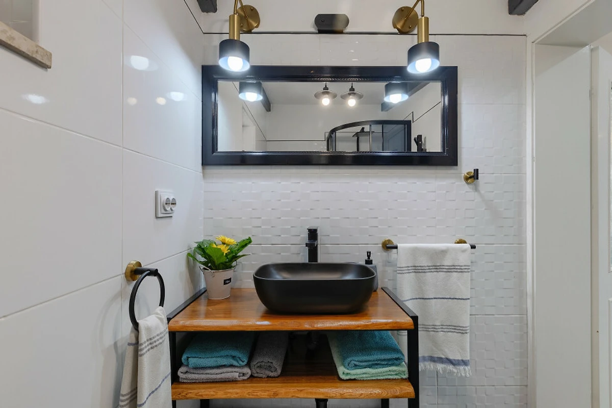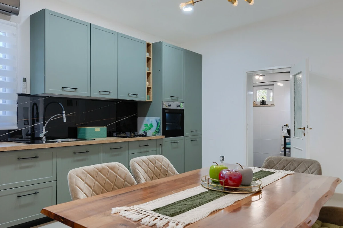Die Unterkunft verfügt über eine voll ausgestattete amerikanische Küche mit Glaskeramik-Kochplatten, Kühlschrank, Gefrierschrank, Backofen, Geschirrspüler, Kaffeemaschine und kompletter Küchenausstattung. Ein praktischer Waschtrockner und ein Bügeleisen werden ebenfalls für den Komfort der Gäste bereitgestellt. Die Immobilie verfügt über ein Badezimmer mit Dusche und sorgt so für Bequemlichkeit während Ihres Aufenthalts.