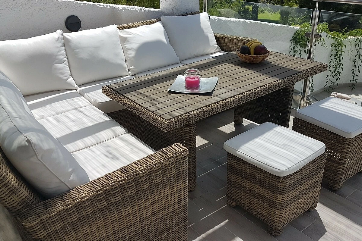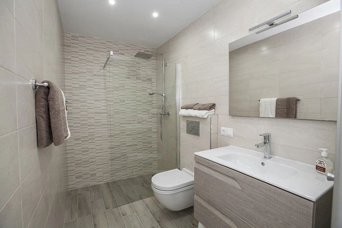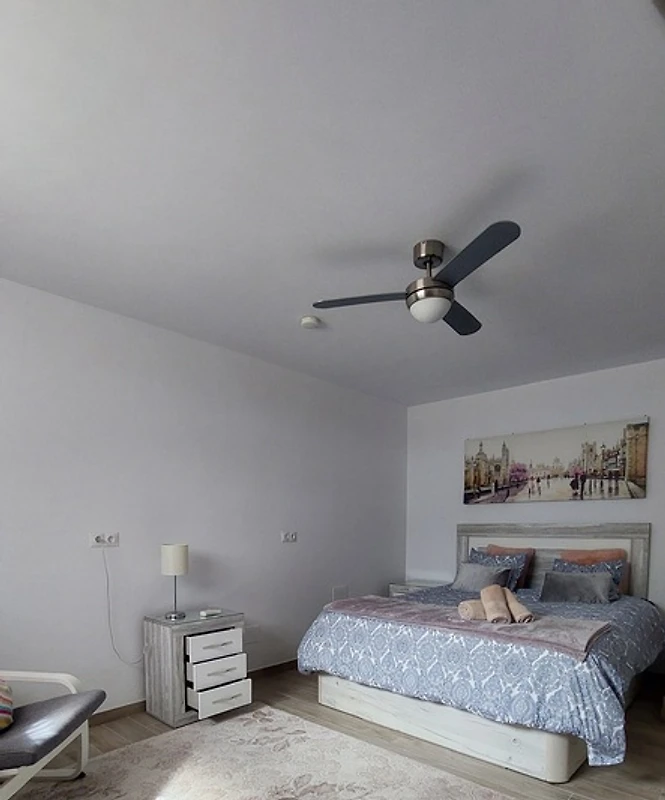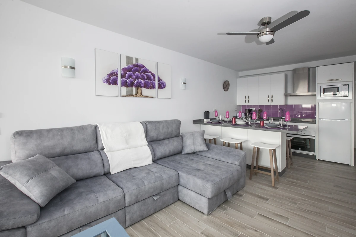 Genießen Sie Meerblick und Bergblick von der Terrassen-Lounge oder nutzen die zusätzliche Sonnenterrasse in einer modern eingerichteten Ferienwohnung für 2-6 Personen. Die Wohnung verfügt über zwei Schlafzimmer mit King-Size Betten, zwei Bäder mit Dusche und WC, eine Kücheninsel mit modernen höhenverstellbaren Drehstühlen und ein separates Wohnzimmer mit Schlafcouch. Zur Ausstattung gehören Klimaanlagen (warm + kalt), Vans, Fußbodenheizung, Rollarden, Isolierglasfenster mit integrierten Fliegengittern, kostenloses WLAN, 3x Smart TV, über Glasfaser mit deutschen und internationalen Programmen, DVD Player, sowie Babybett und Hochstuhl.