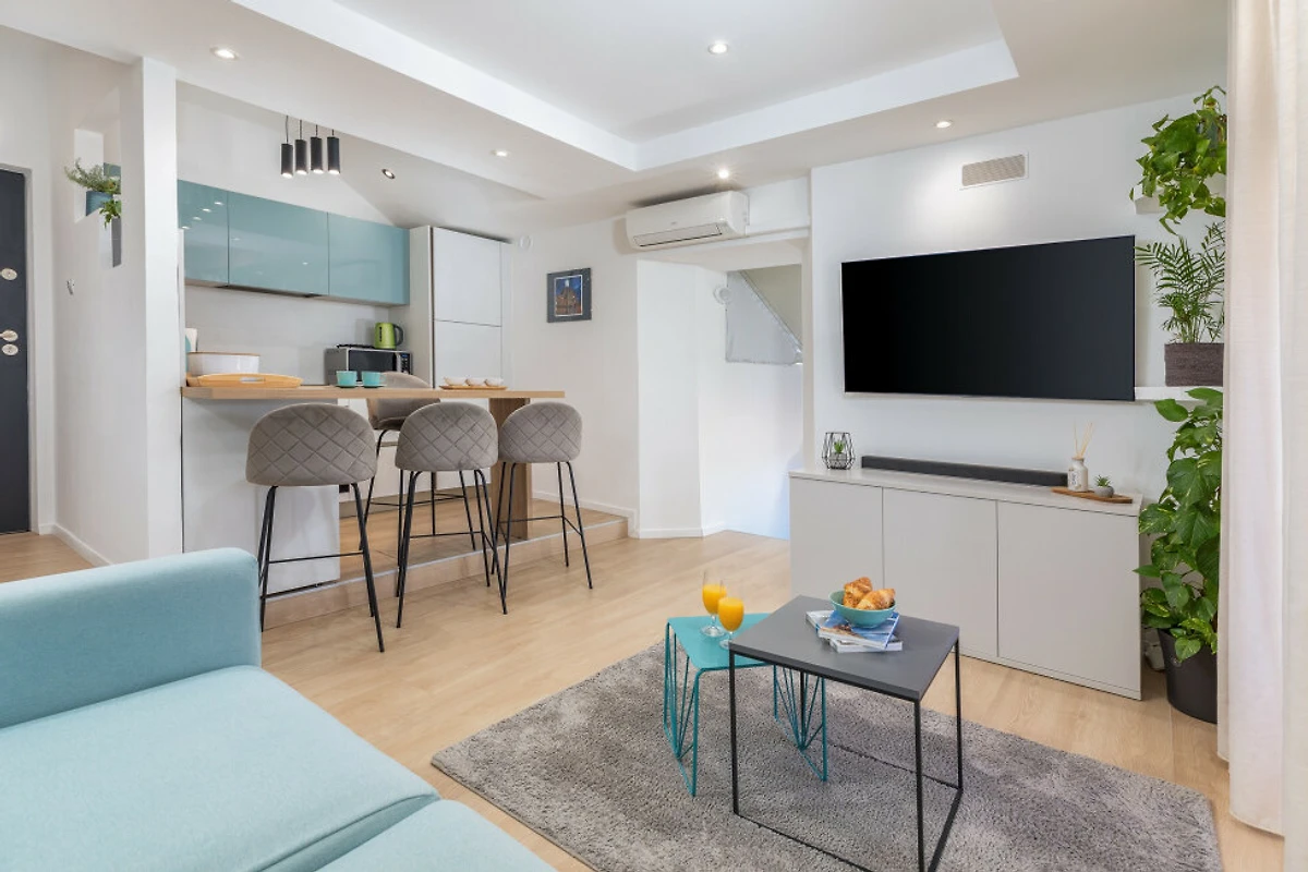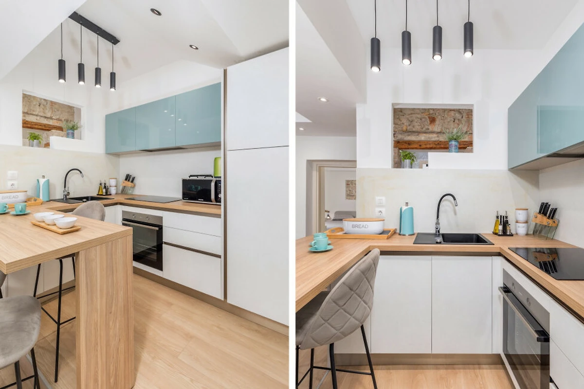 Die Wohnung verfügt über eine gut ausgestattete amerikanische Küche mit allen wesentlichen Geräten, einschliesslich einer Glaskeramik-Kochplatte, Kühlschrank, Gefrierschrank, Backofen, Mikrowelle, Geschirrspüler, Kaffeemaschine und Toaster. Die Gäste werden die umfassende Küchenausstattung und Geschirr zu schätzen wissen, die eine einfache Mahlzeitenzubereitung ermöglichen.