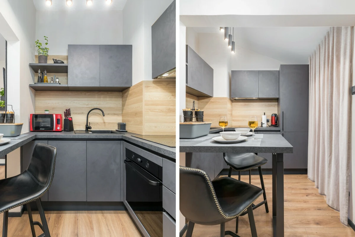 Das Studio verfügt über ein Queensize-Bett, das einen erholsamen Schlaf gewährleistet und durch zeitgemässe Einrichtungen und durchdachtes Design ergänzt wird. Eine amerikanische Küche ist vollständig ausgestattet mit modernen Annehmlichkeiten, einschliesslich einer Glaskeramik-Kochplatte, Kühlschrank, Gefrierschrank, Backofen, Mikrowelle, Geschirrspüler, Kaffeemaschine, Toaster und einem kompletten Satz an Küchenutensilien und Geschirr - alles, was Sie benötigen, um köstliche Mahlzeiten zuzubereiten.