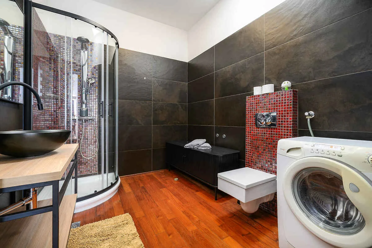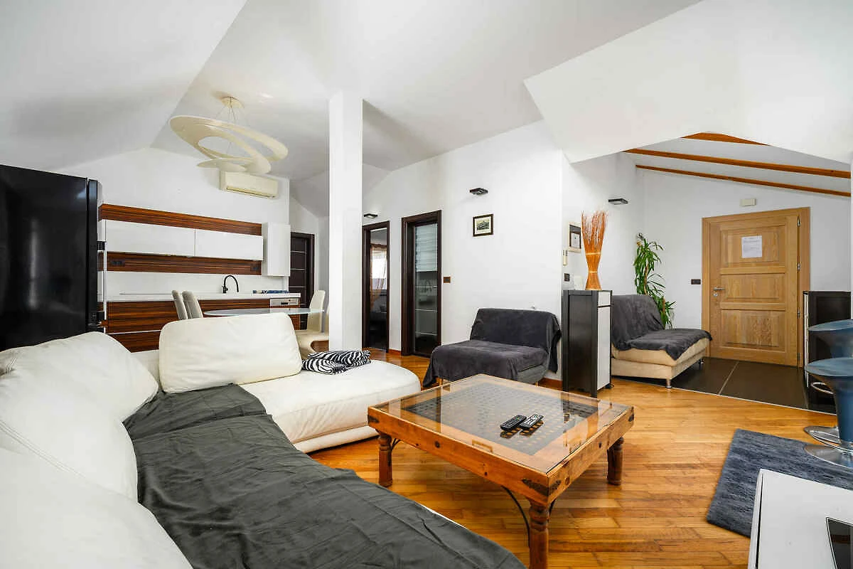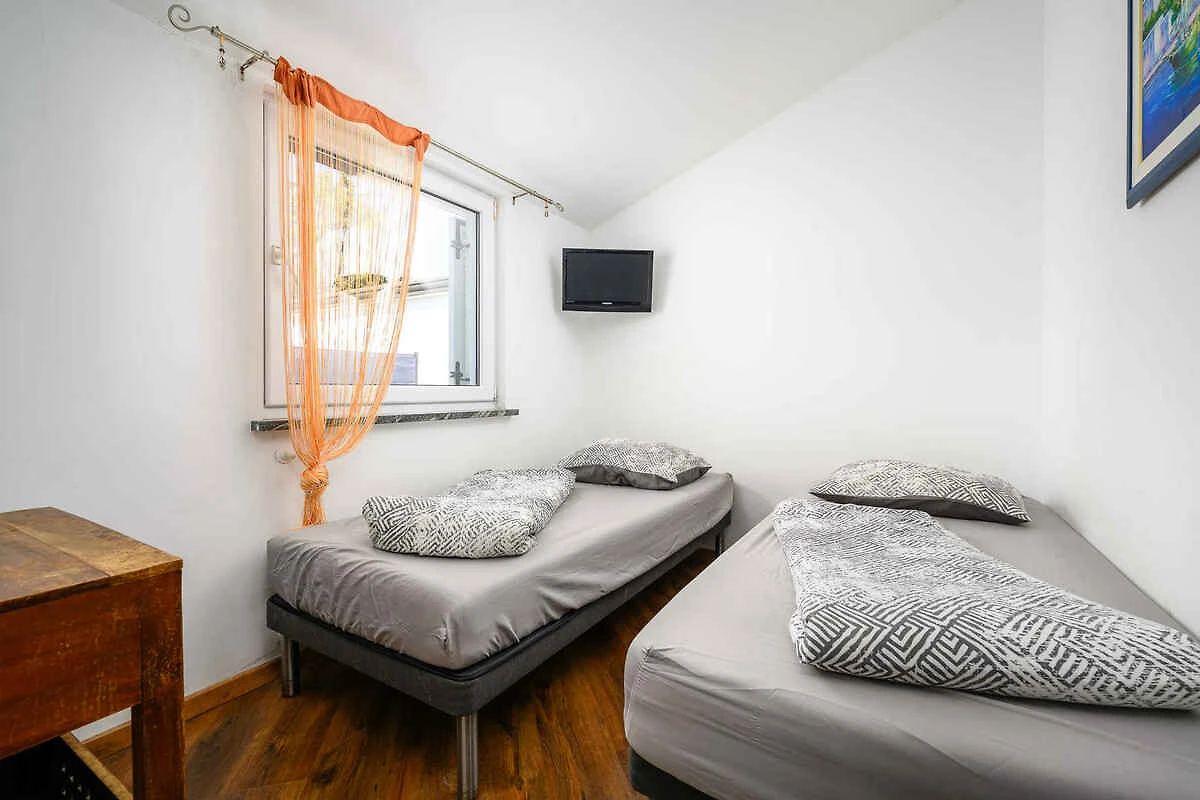 und führt direkt in den Vorraum. Wohnzimmer mit 1 Zusatzbett auf Couch/Sofa, TV und Zugang zum Balkon. Schlafzimmer mit 2 Einzelbetten. Schlafzimmer mit 1 Doppelbett. Kochecke mit Essecke (4 Plätze), Elektroherd (Induktionsherd, 4 Platten), Dunstabzugshaube, Geschirrspüler, Kühlschrank und Kaffeemaschine. Bad mit Waschmaschine, Dusche, 1 Waschbecken und WC.