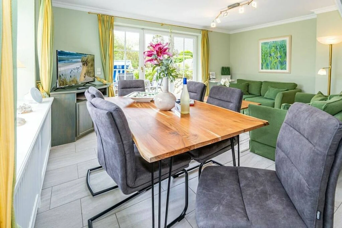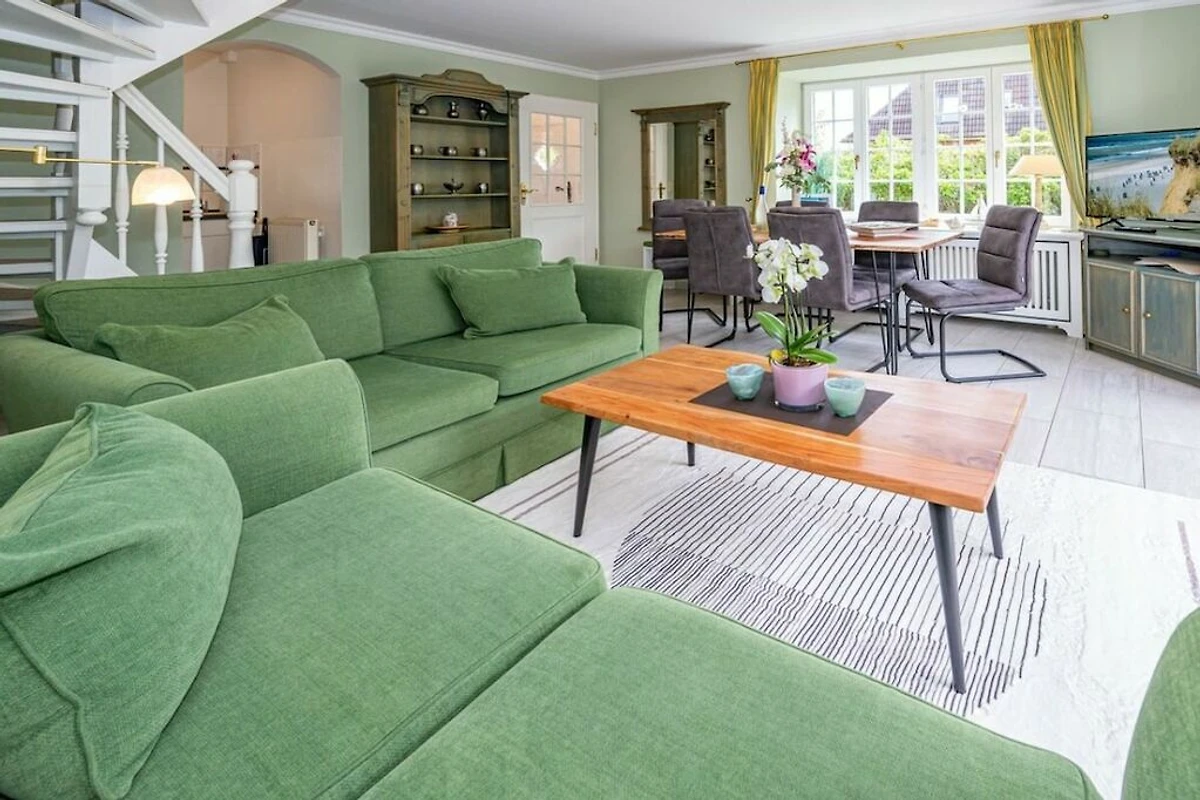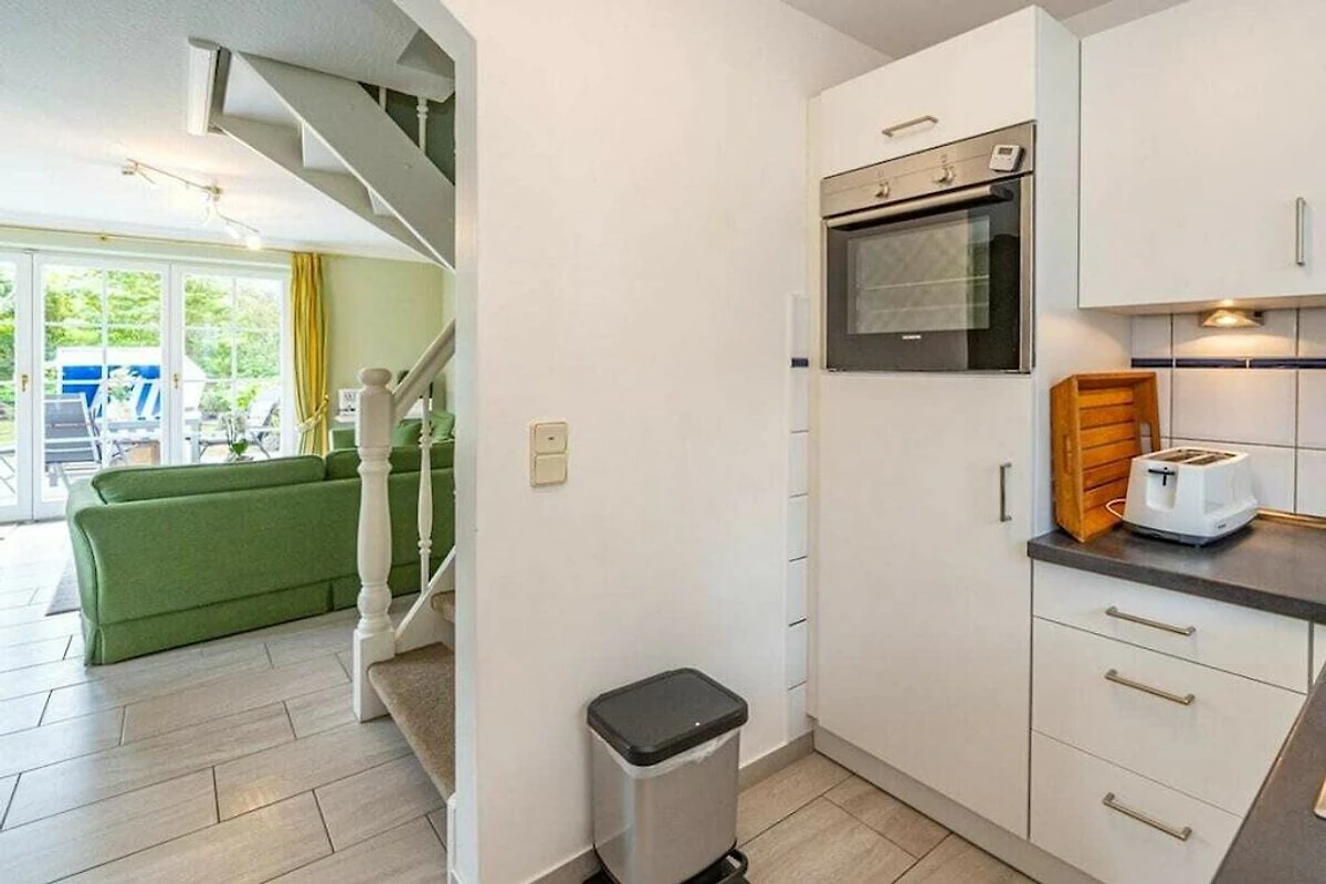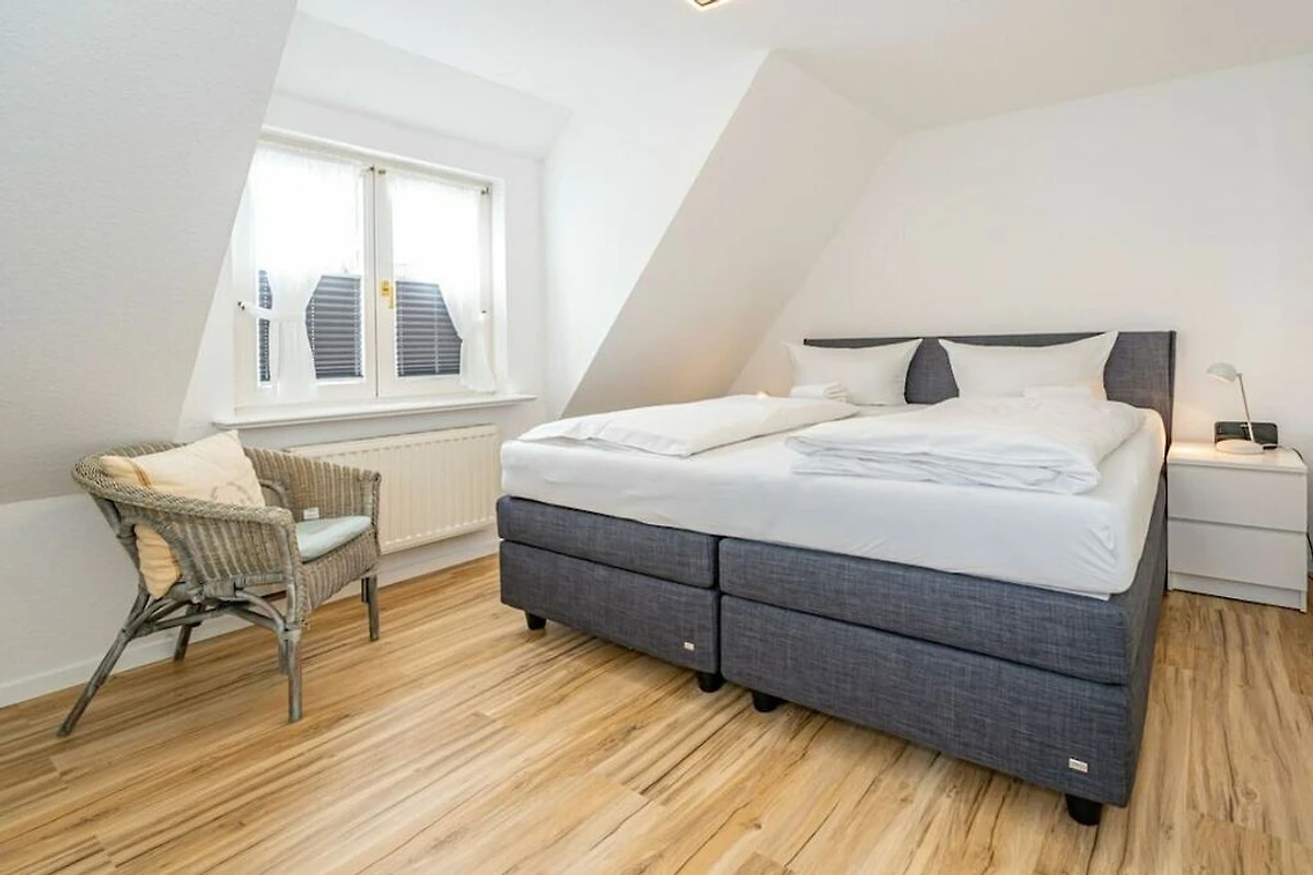Im Erdgeschoss erreichen Sie durch einen Windfang einen geschmackvoll eingerichteten Wohn-Essraum, das Herzstück der Wohnung, mit Sofaecke und großem Esstisch für 6 Personen. Außerdem verfügt die Unterkunft über Fußbodenheizung, Kabel-Flachbild TV, DVD Player, Radio, Telefon sowie WLAN. Eine separate Küche mit Ceranfeld, Geschirrspüler, Backofen, Mikrowelle und Kühlschrank ist vorhanden. Ein Gäste WC im Erdgeschoss, ein Duschbad im 1OG und eine Toilette im 2. OG sind vorhanden.