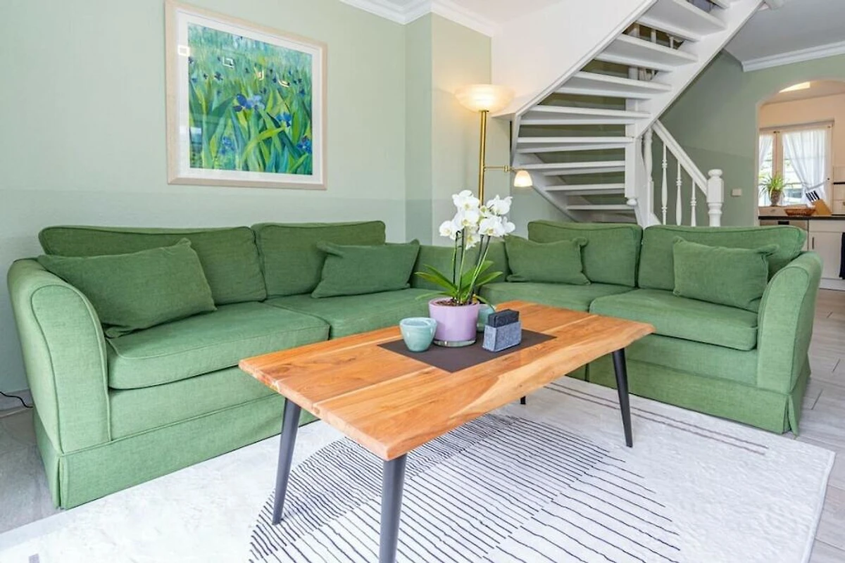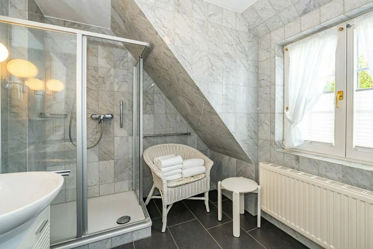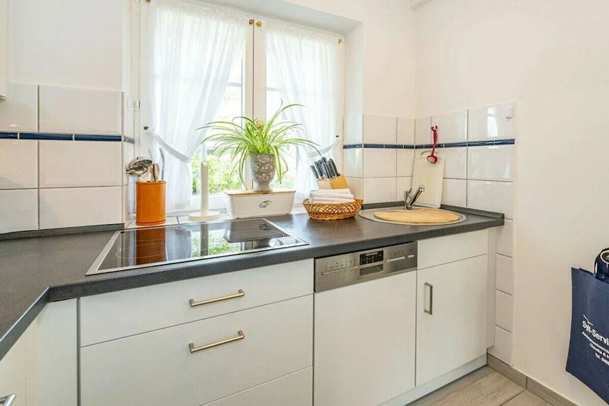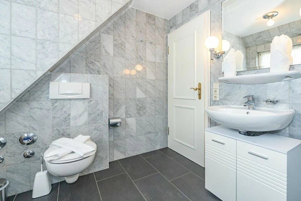 Im Erdgeschoss erreichen Sie durch einen Windfang einen geschmackvoll eingerichteten Wohn-Essraum, das Herzstück der Wohnung, mit Sofaecke und großem Esstisch für 6 Personen. Außerdem verfügt die Unterkunft über Fußbodenheizung, Kabel-Flachbild TV, DVD Player, Radio, Telefon sowie WLAN. Eine separate Küche mit Ceranfeld, Geschirrspüler, Backofen, Mikrowelle und Kühlschrank ist vorhanden. Ein Gäste WC im Erdgeschoss, ein Duschbad im 1OG und eine Toilette im 2. OG sind vorhanden.
