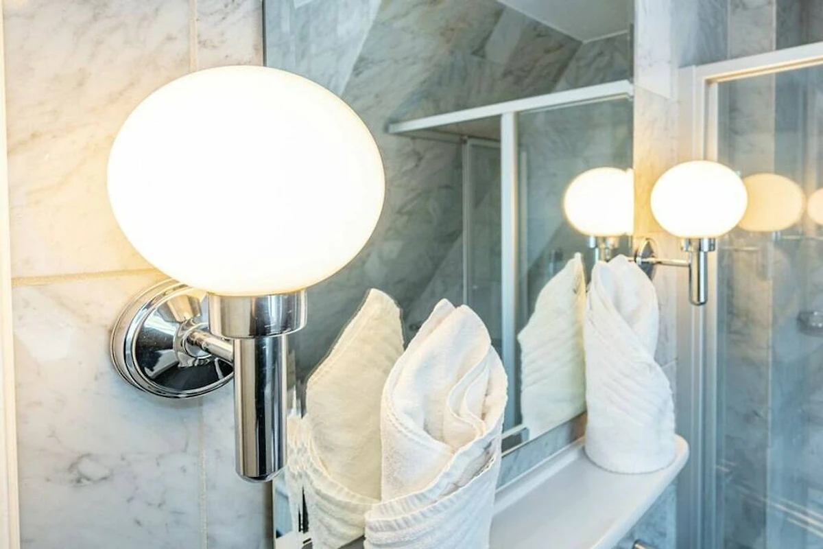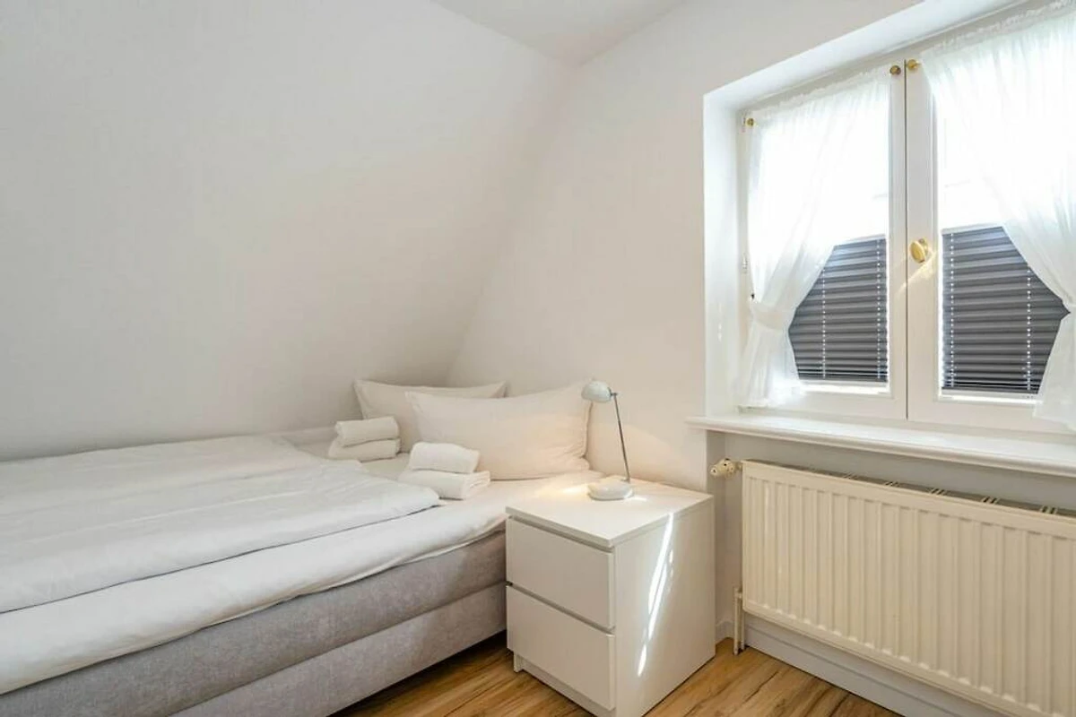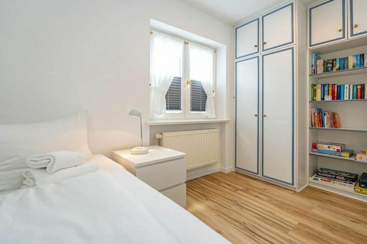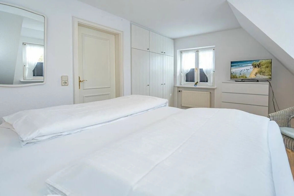 Das große Schlafzimmer hat ein Doppelbett (2 x 90 cm Breite), Einbauschänke sowie ein Kabel-Flachbild TV und Schreibtisch. Im kleineren Schlafzimmer ist ein französisches Bett (1,50 m Breite ) sowie ein Einbauschrank. Das Badezimmer mit Dusche, WC und Waschbecken hat Fußbodenheizung.