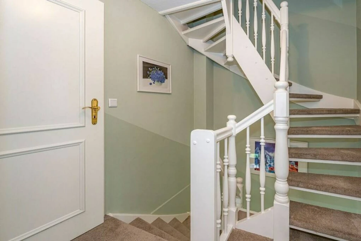 Eine nordisch weiße Holztreppe führt in das Obergeschoss,