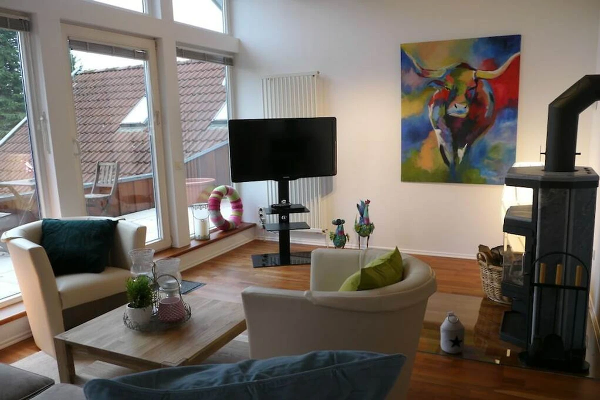 Mit den zahlreichen großen Fenstern ist die Wohnung sehr großräumig und hell. Für die kältere Jahreszeit verfügt die Wohnung über einen Kamin im Wohnbereich.