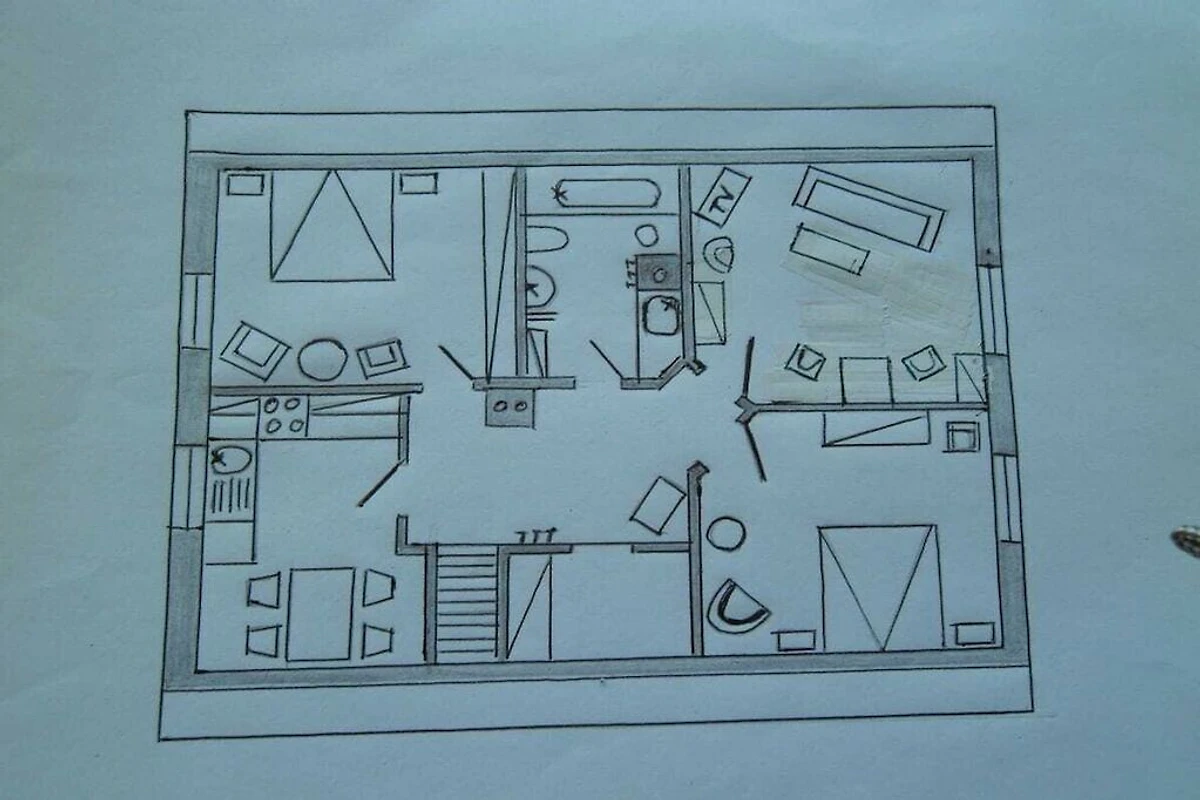 Dachgeschoss: (Eingangshalle(, ), Wohnzimmer(, , Bibliothek, TV, Esstisch, DVD-Spieler, Radio), Küche(, , , Kochnische, Esstisch, Herd, Kochplatte, Wasserkocher, Toaster, Kaffeemaschine, Grill, Mikrowelle, Kühlschrank), Schlafzimmer(, , , Doppelbett), Schlafzimmer(, , , Einzelbett, Einzelbett), Badezimmer(, , Toilette, Badewanne, Dusche, Waschbecken, Föhn), Abstellraum(, Bügelbrett, Bügeleisen, Trockenschrank))